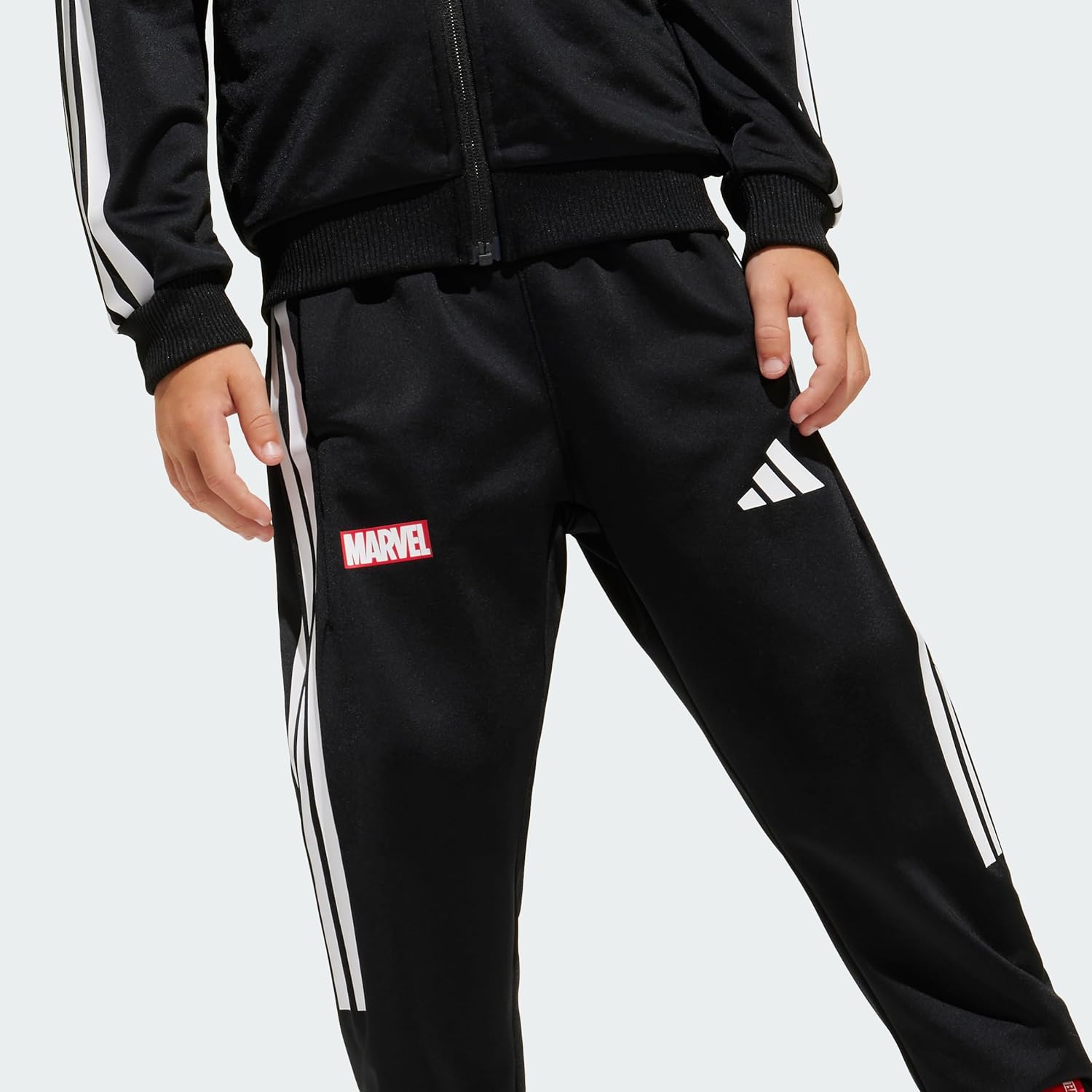 أطلق العنان لبطلك الخارق الداخلي مع بدلة اديداس Marvel Spider-Man Tiro. هذا البنطال الرياضي للجنسين، مصنوع بالكامل من البولي ايثيلين تيريفثالات المعاد تدويره، يتميز بطباعة سبايدر مان الملونة بنصف لون في الجزء الخلفي من جاكيت البدلة الرياضية. يضمن الجزء العلوي والسفلي ذو المقاس العادي الراحة، بينما يضيف السحاب الكامل الأمامي المركزي الراحة. احتضن الحركة والحركة والمرح لكونك بطل أكشن، كل ذلك أثناء ارتداء العلامة التجارية اديداس | Marvel Lockup.