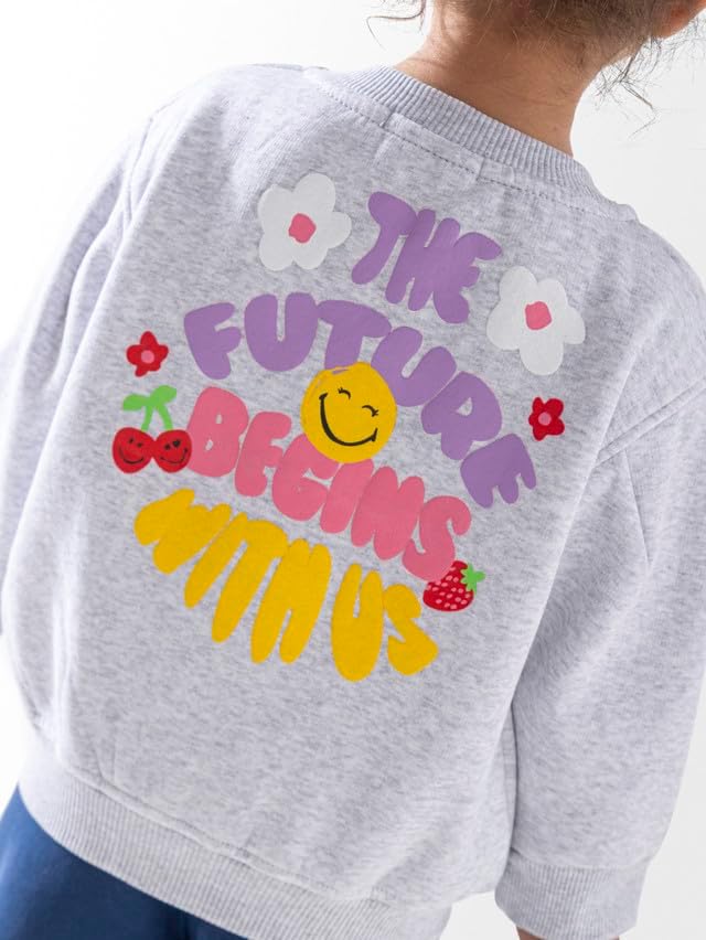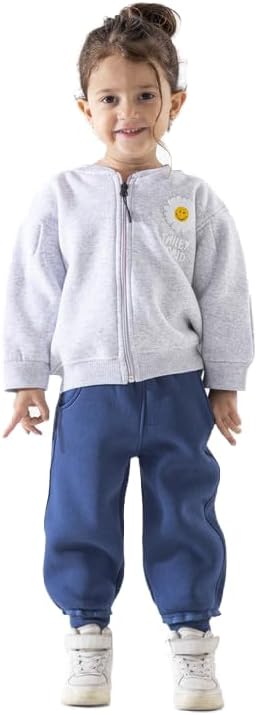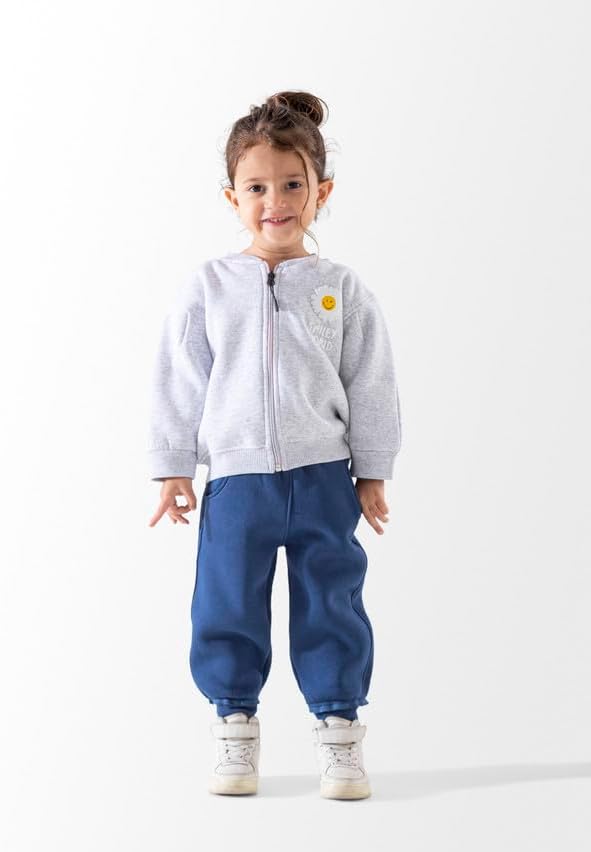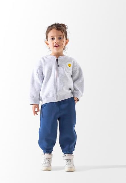 طقم بدلة رياضية مريحة للأطفال مصنوع من مزيج من القطن الناعم. يتضمن هودي بسحاب رمادي فاتح مع طباعة وجه مبتسم لطيف وسروال رياضي أزرق كحلي. مثالي للارتداء اليومي أو ممارسة الرياضة أو الاسترخاء.