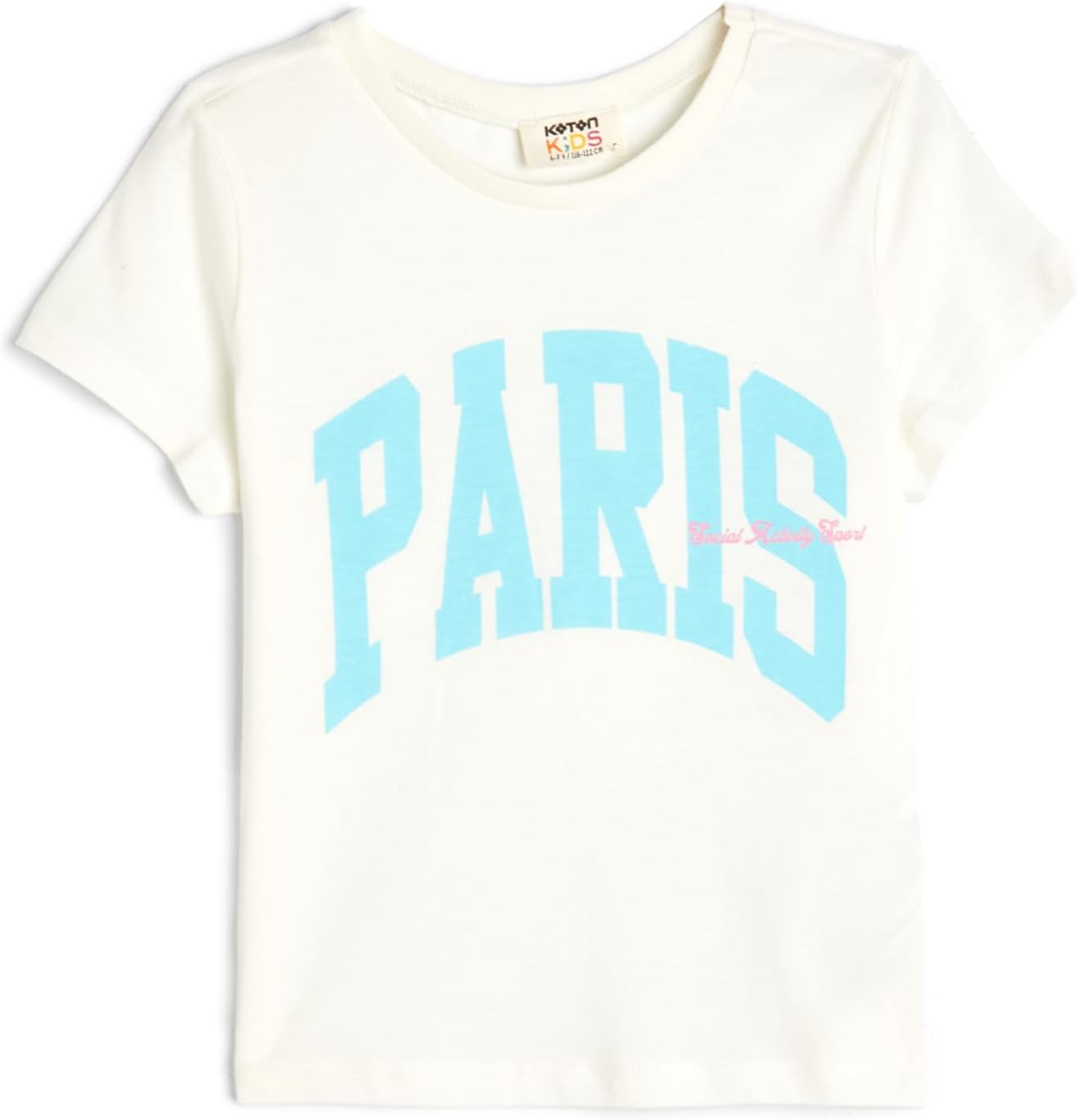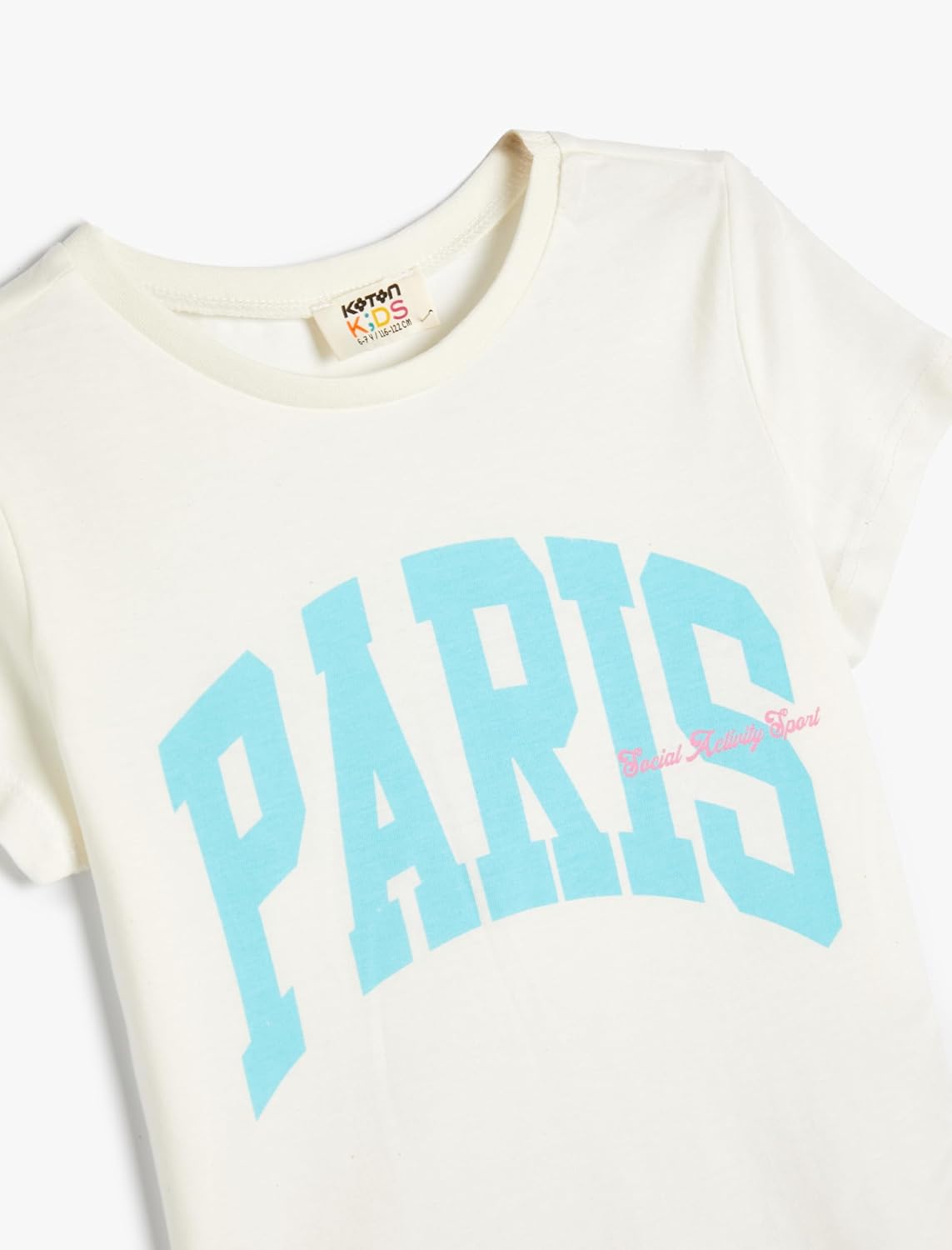 تيشرت بأكمام قصيرة بطباعة كلمة «Paris» للبنات من كوتون