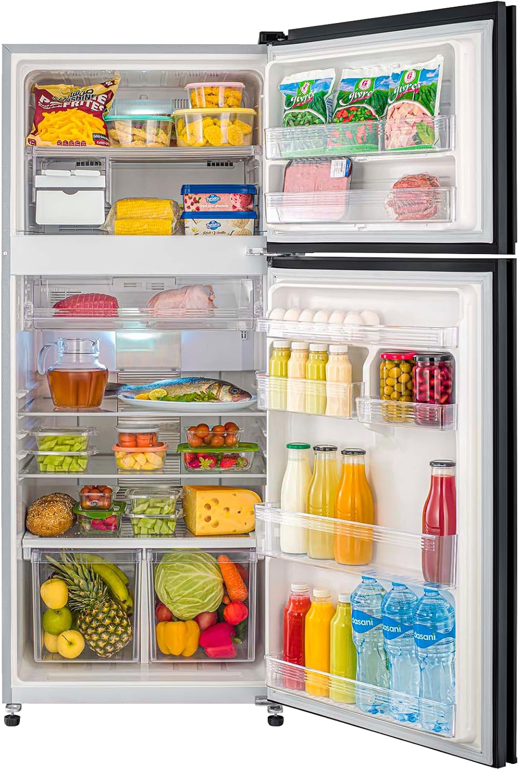 ‎إضاءة LED داخلية لخزانة الثلاجة، الهيكل الداخلي مصنوع من مادة ايه بي اس (مضادة للبكتيريا)، أرفف زجاجية صلبة مع حجرة تبريد وصانع ثلج مزدوج مع أقدام تسوية خالية من مركبات الكربون الكلورية فلورية