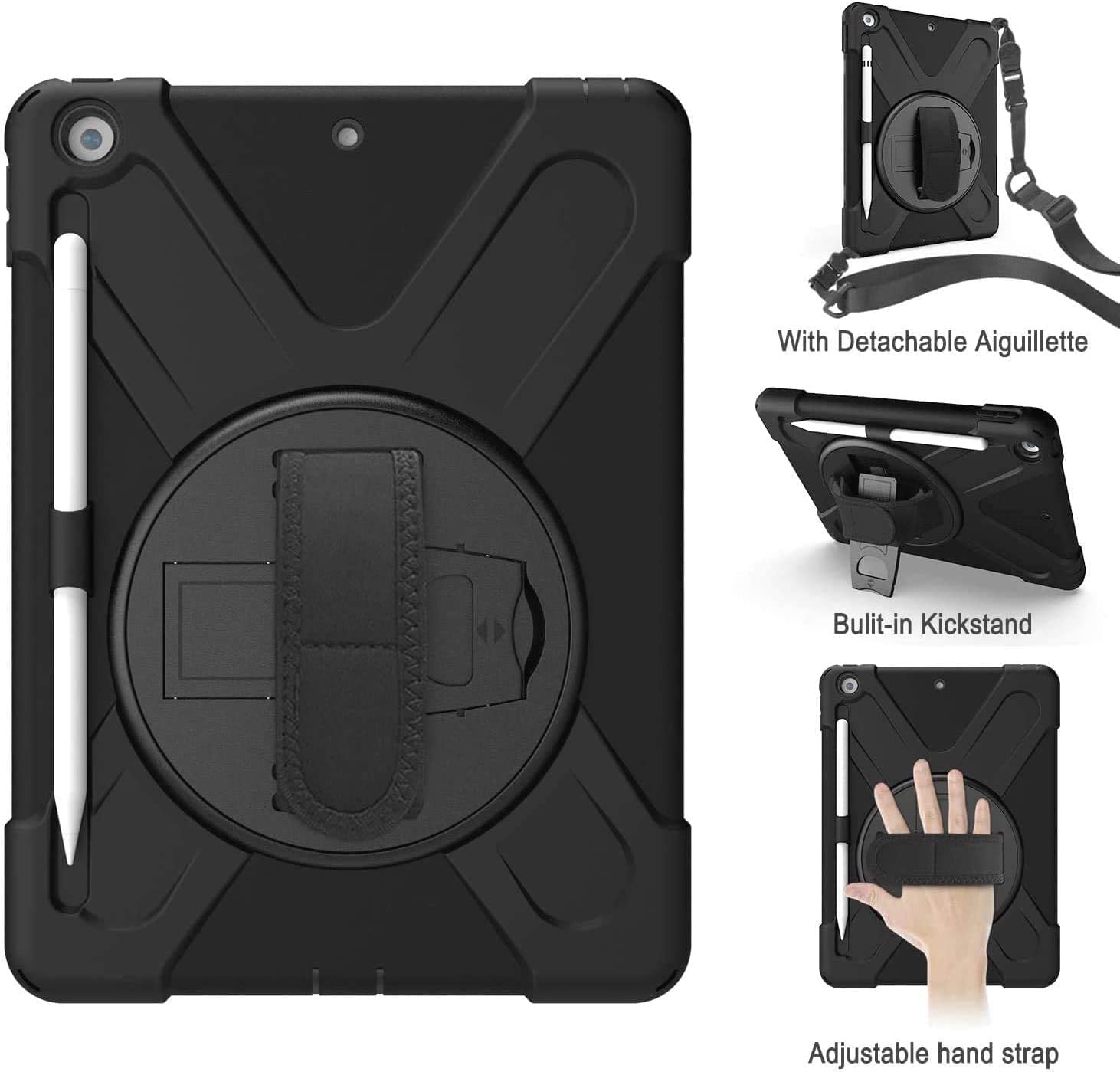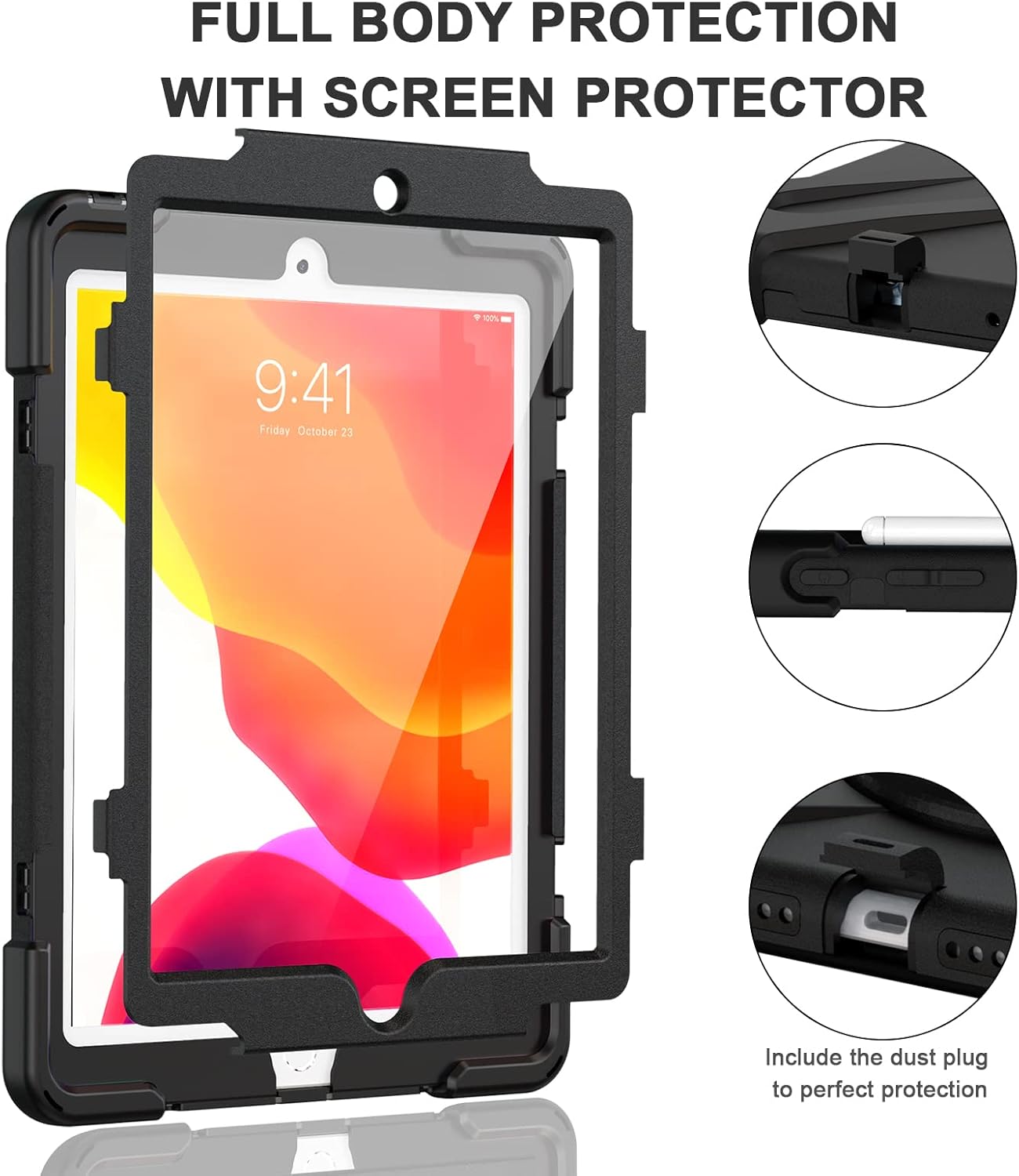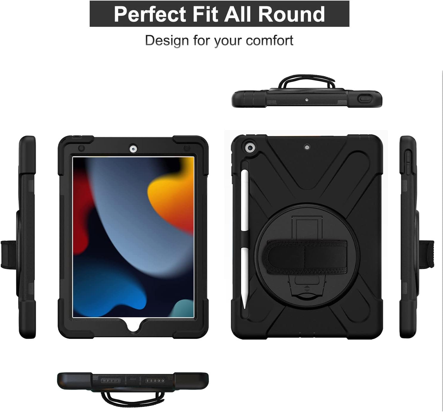 جراب حماية لجهاز اي باد الجيل التاسع/الثامن/السابع مع شاشة حماية، يأتي بتصميم مضاد للصدمات والسقوط مع [حامل قلم] [حامل دوار 360] [حزام كتف]، جراب حماية مصنوع من المطاط من جيروتيك، أسود