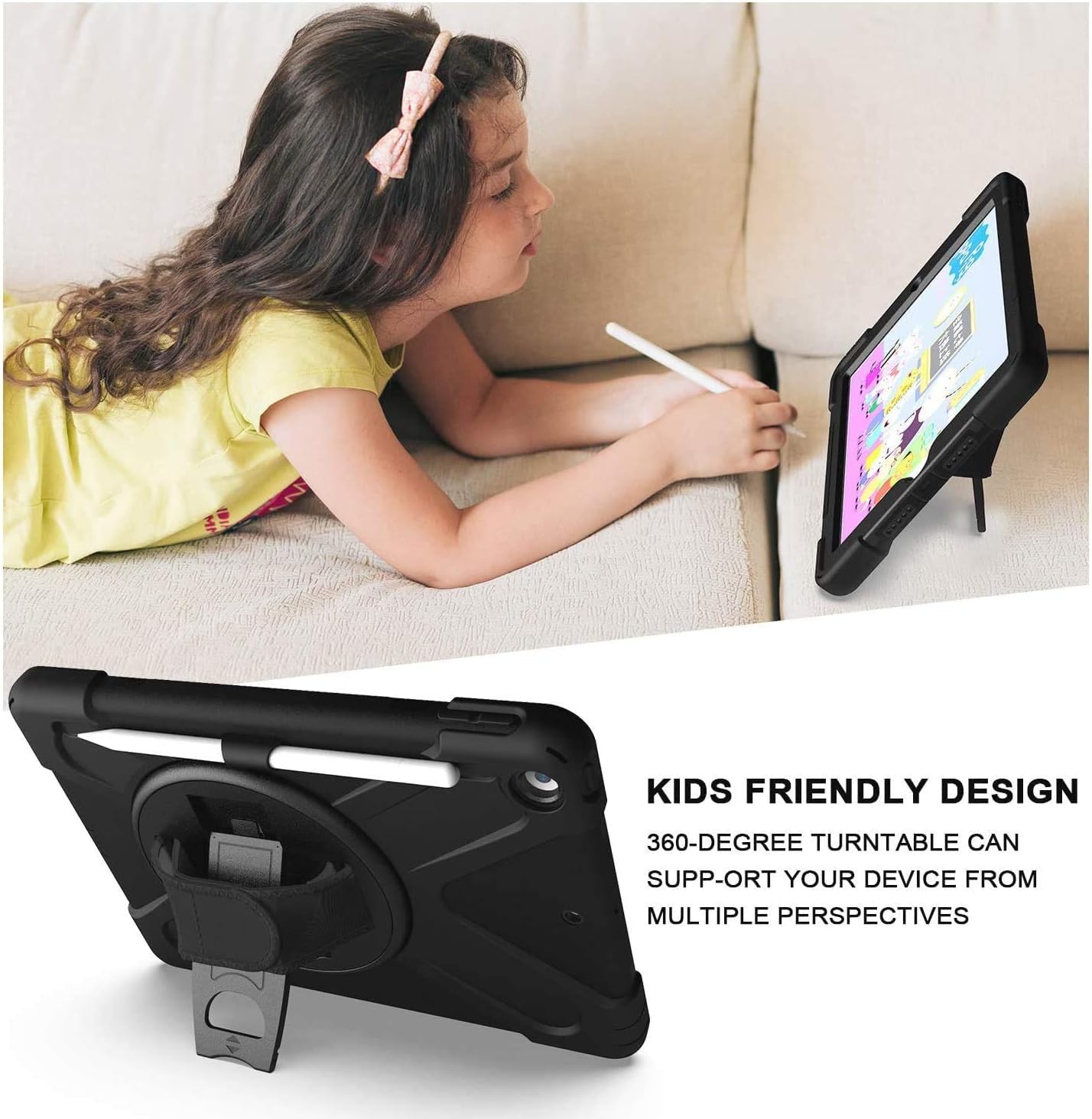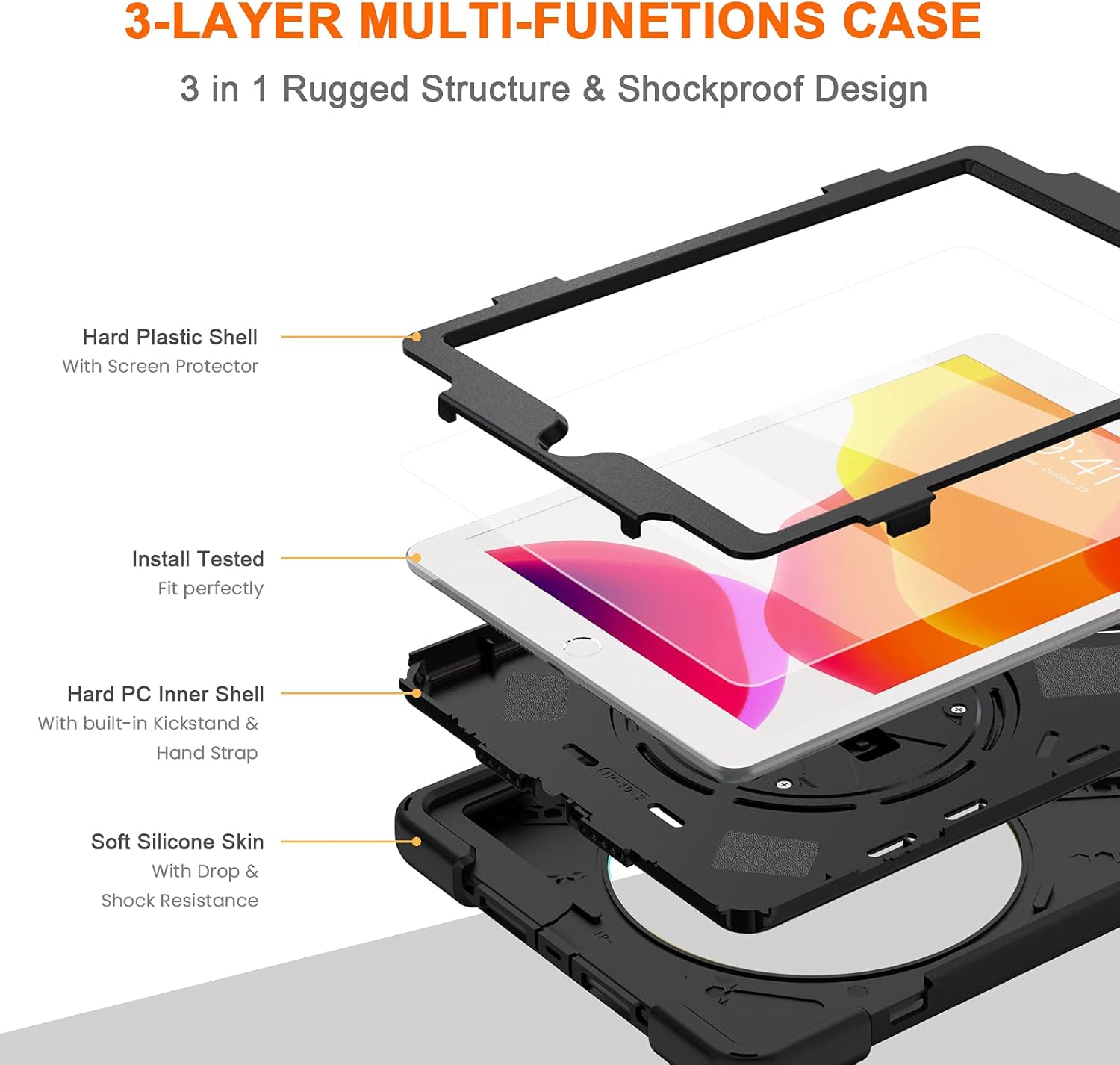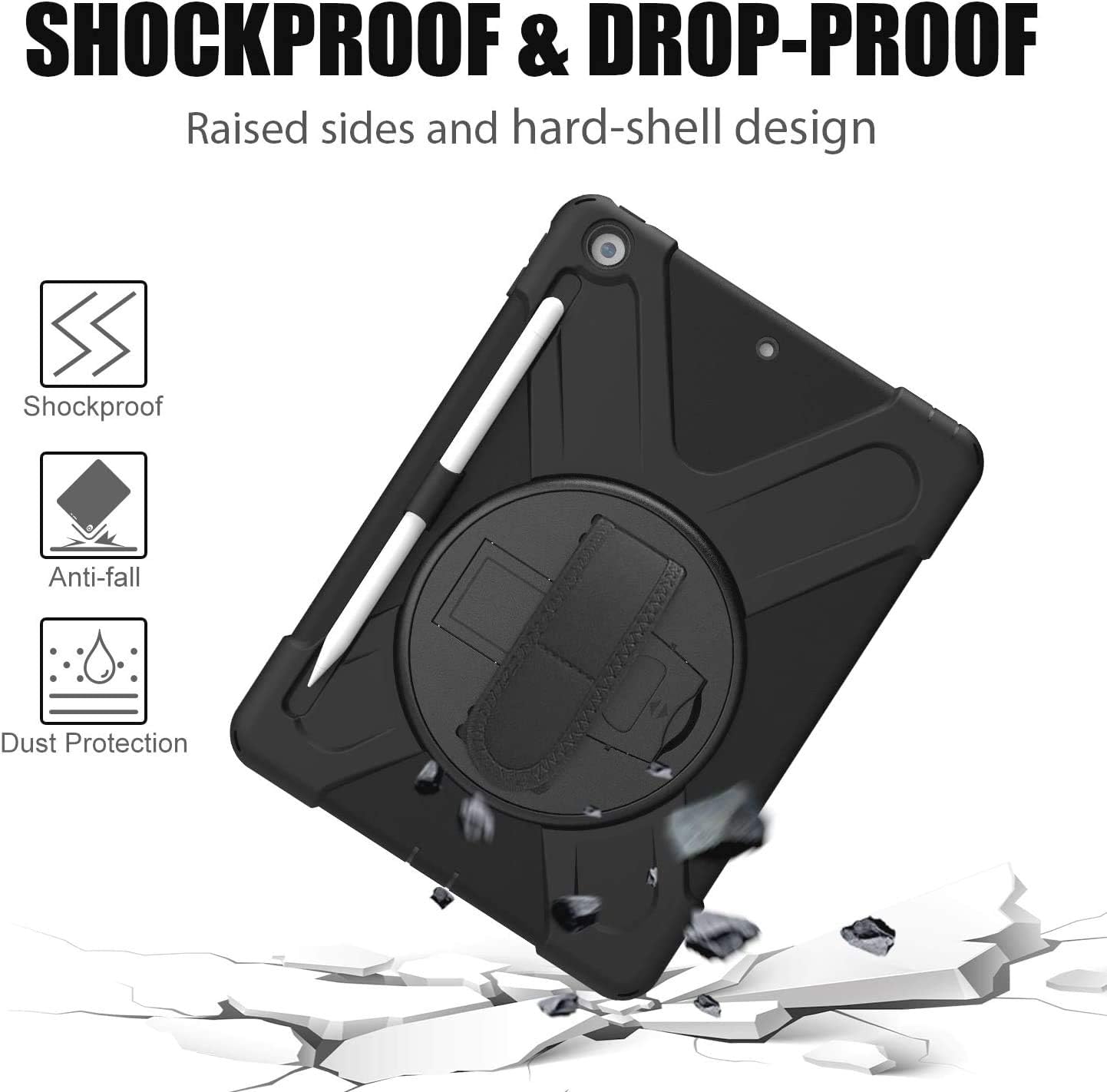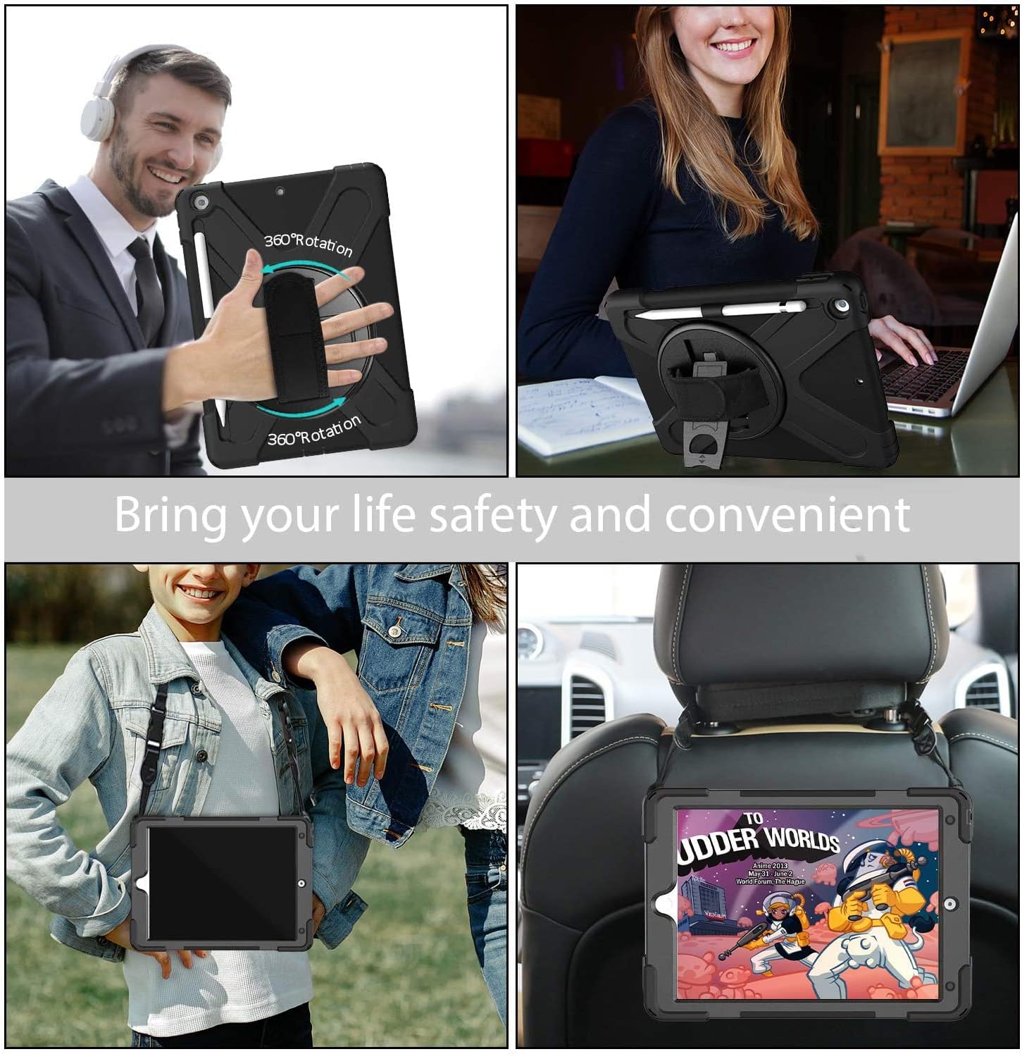 توفر لك حافظة ايباد الجيل التاسع 10.2 شديدة التحمل مع مسند قابل للدوران 360 درجة رؤية وكتابة متعددة الزوايا، حزام يد قابل للتعديل يمكنه حمل التابلت بإحكام بيد واحدة، فكرة للمعلم والمهندس والمصمم.
