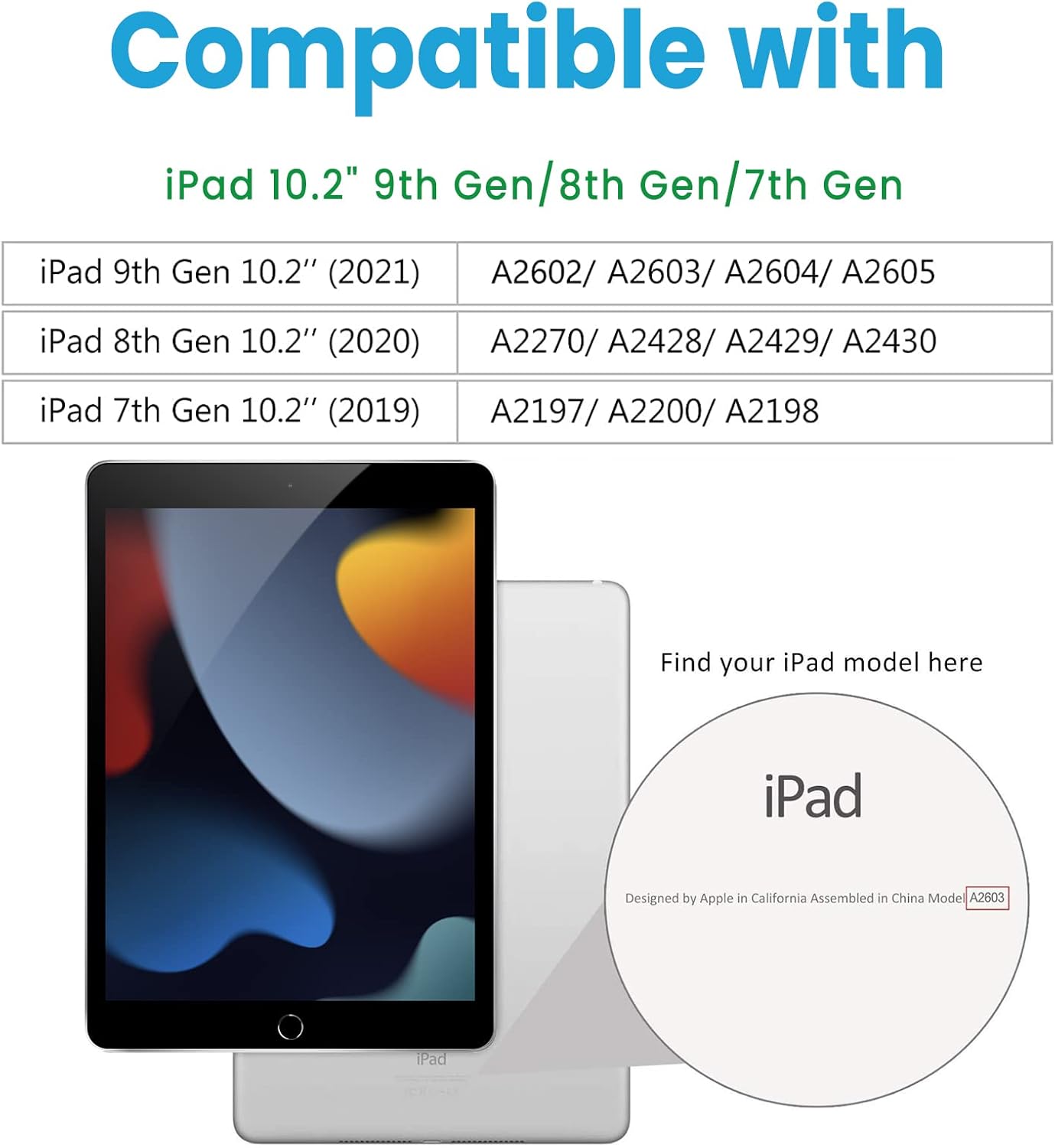 🍀[الموديل المتوافق] يتناسب جهاز اي باد 10.2 بوصة 2021/2020/2019 مع شاشة حماية مدمجة، كما أنّه مصمم خصيصًا لجهاز اي باد الجيل التاسع/الثامن/السابع/اي باد 10.2 بوصة موديل (A2602، A2603، A2604، A2605، A2200، A2198، A2197، A2270، A2428، A2429، A2430). جراب الحماية هذا غير متوافق مع أي موديلات أخرى لأجهزة اي باد، لذلك يرجى التحقق من رقم الموديل الموجود على الجهة الخلفية من جهاز اي باد (❗❗ملاحظة: يأتي مع شاشة حماية مدمجة ❗❗)، أما قلم آبل فهو غير متضمن.