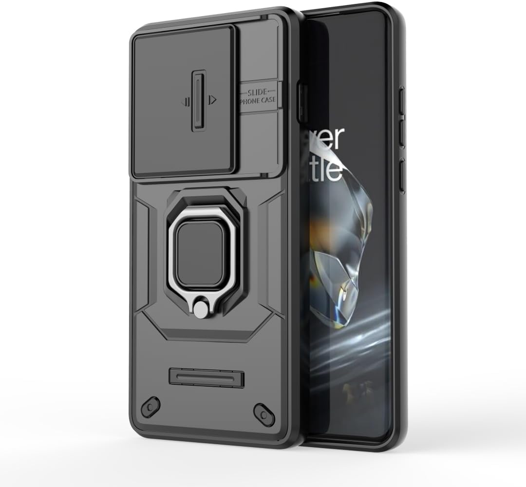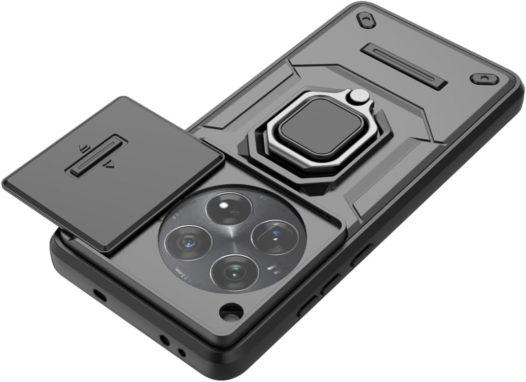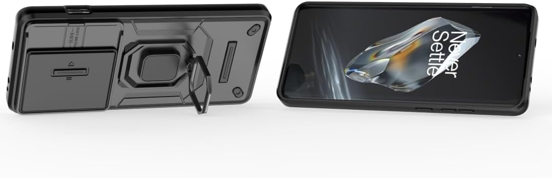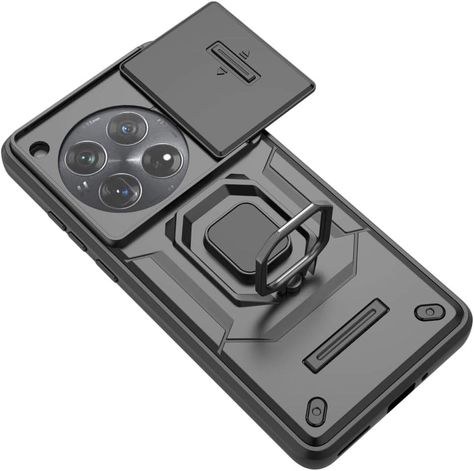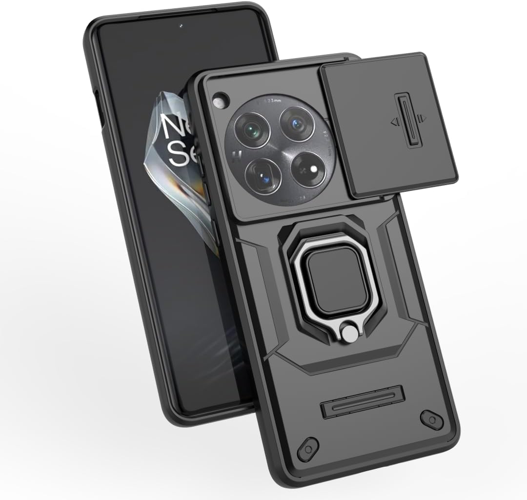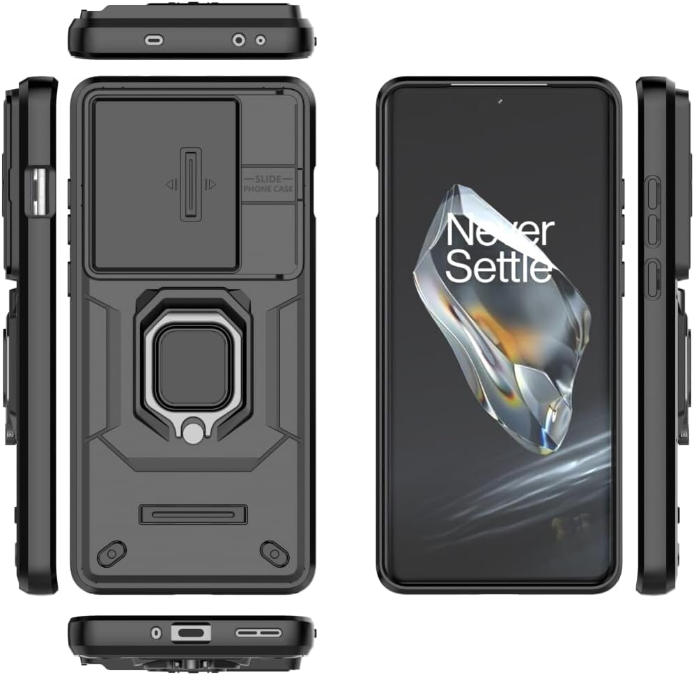 جراب متوافق مع وان بلس 12 – غطاء حماية مزدوج شديد التحمل ومضاد للانزلاق مع حلقة معدنية – مع غطاء حماية منزلق للكاميرا يغلق بإحكام – أسود