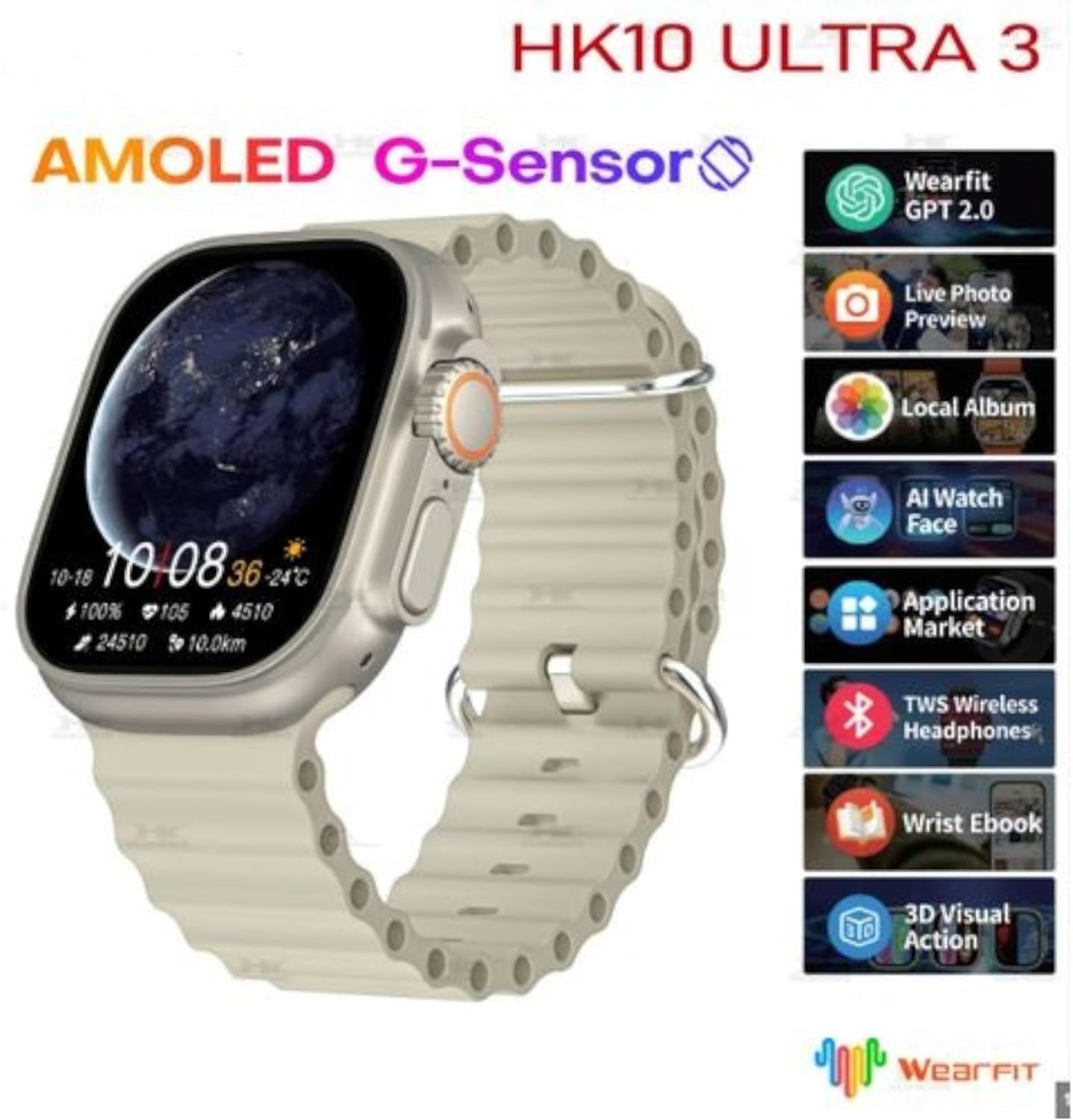 الموديل: موبايل اتش كيه 10 برو ماكس بشاشة أمولد وعمر بطارية طويل. بطارية تدوم طويلاً لاستخدام ممتد دون الحاجة لإعادة شحن متكررة. تصميم عصري: تصميم أنيق ومتعدد الاستخدامات يناسب مختلف المناسبات والأذواق الشخصية. تقنية الإشعارات الذكية: تابع مكالماتك ورسائلك وإشعارات تطبيقاتك مباشرة على ساعتك الملتفة حول معصمك. تتبع النشاط البدني: يشمل تتبع الخطوات ومراقبة معدل ضربات القلب وتحليل النوم. يدعم تطبيق: يتصل بالتطبيق لتوفير ميزات صحية وذكية محسنة. سوق تطبيقات GPT2.0: الوصول إلى تطبيقات وميزات إضافية عبر سوق GPT2.0. معاينة الصور المباشرة: معاينة حية لكاميرا الموبايل عن بُعد على ساعتك الذكية. الوصول إلى الألبوم المحلي: عرض وإدارة ألبومات الصور مباشرة من الساعة. سماعات رأس لاسلكية تي دبليو اس متوافقة: يمكن إقرانها بسهولة مع سماعات الأذن تي دبليو اس لإجراء المكالمات والموسيقى. قارئ كتب إلكترونية للمعصم: اقرأ الكتب الإلكترونية بسهولة على معصمك في أي وقت. واجهة حركة بصرية ثلاثية الأبعاد: واجهة ثلاثية الأبعاد تفاعلية لتجربة مستخدم ديناميك. دعم اللغة العربية: يدعم عرض اللغة العربية بالكامل (غير معكوس أو عاكس).