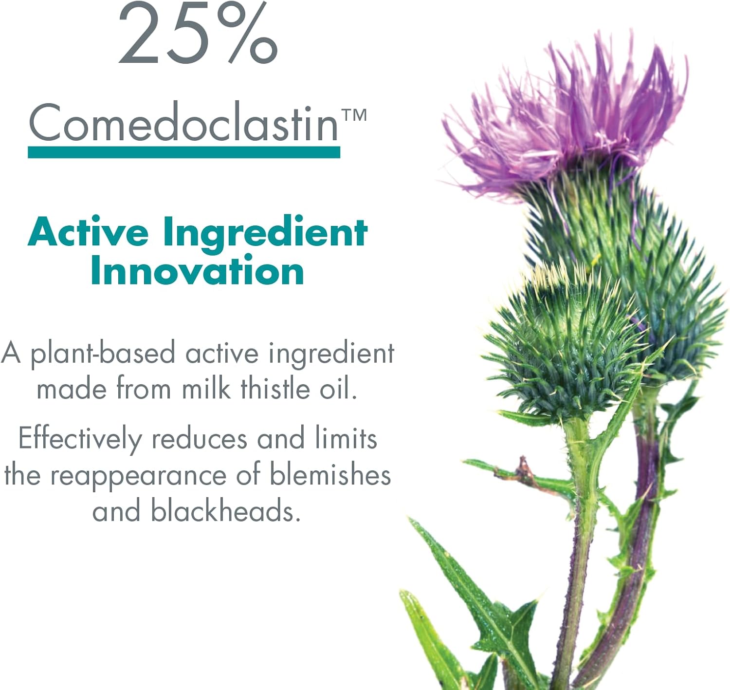 كوميدوكلاستين – نشاط نباتي 100% حاصل على براءة اختراع، يعمل على الخلايا الجذعية ويوقف دورة حب الشباب، مما يضمن عمل ثلاثي مضاد لحب الشباب..