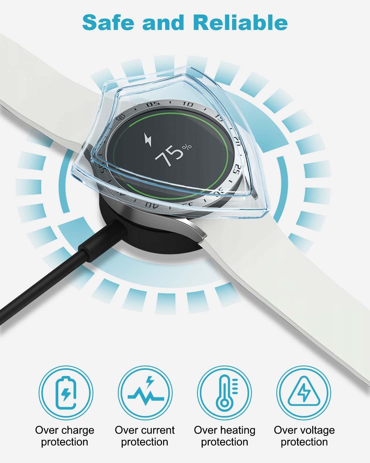 شحن آمن وسريع لكابل شحن ساعة سامسونج: شاحن ساعة جالاكسي 6 مزود بميزات أمان مدمجة متطورة لتجنب الدوائر القصيرة والسخونة الزائدة والحمل الزائد. التصميم الداخلي لشاحن ساعة سامسونج يكتشف حالة الشحن بذكاء ويعدّل إمداد الطاقة تلقائيًا عند الشحن الكامل. يصبح شاحن ساعة جالاكسي 4 دافئًا قليلًا أثناء الشحن، ولكن بفضل خاصية الحماية من الحرارة الزائدة، تبقى درجة الحرارة ضمن الحدود الآمنة.