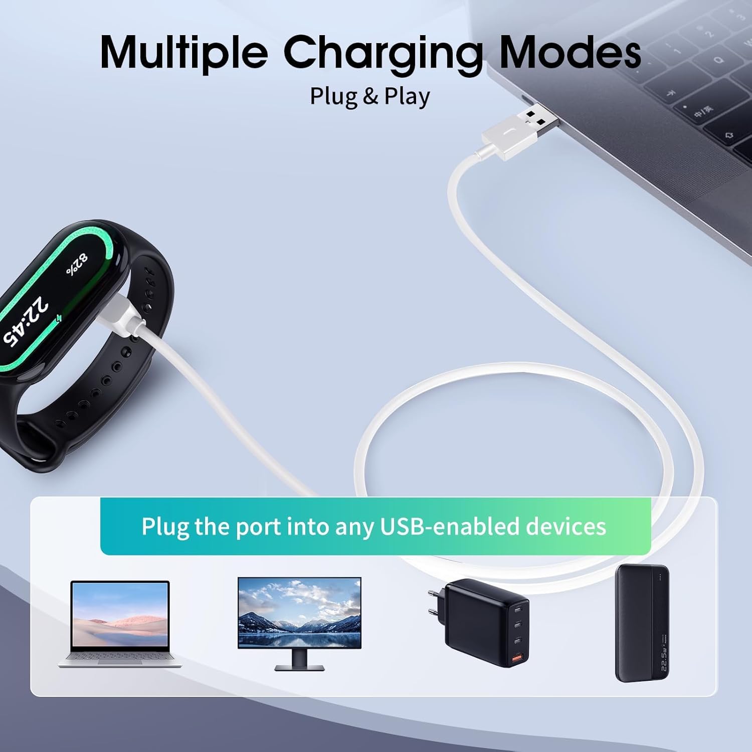 محمول وخفيف الوزن: كابل شحن مي باند 8 برو الخاص بنا بطول 3.3 قدم (100 سم)، صغير الحجم، يشغل مساحة صغيرة، سهل التخزين والحمل، بديل رائع للشحن في المكتب أو المنزل أو أثناء السفر.
