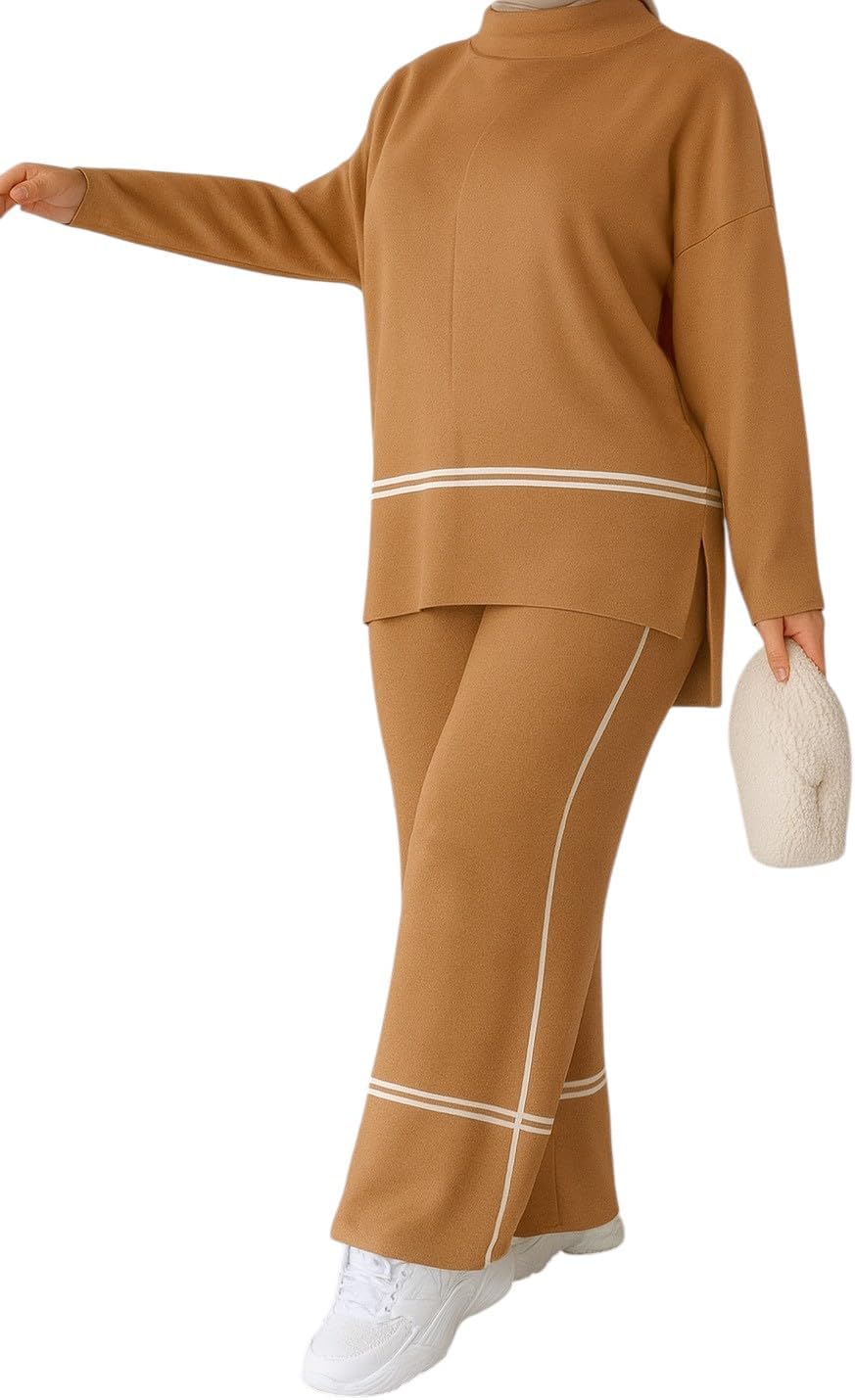 طقم بدلة رياضية نسائية من القطن خطين أبيض، بنطال واسع وبلوزة طويلة الأكمام للراحة المنزلية والرياضة للبنات والنساء سوت قطعتين بمقاس واحد من ميزا