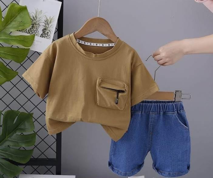 طقم خروج أولادي – مكون من قطعتين تيشيرت بجيب أمامي أنيق ومميز مع شورت جينز بجيوب جانبية وبتصميم عصري ومريح للأولاد (بني, 8 (تلبيس 7-8 ) سنوات)
