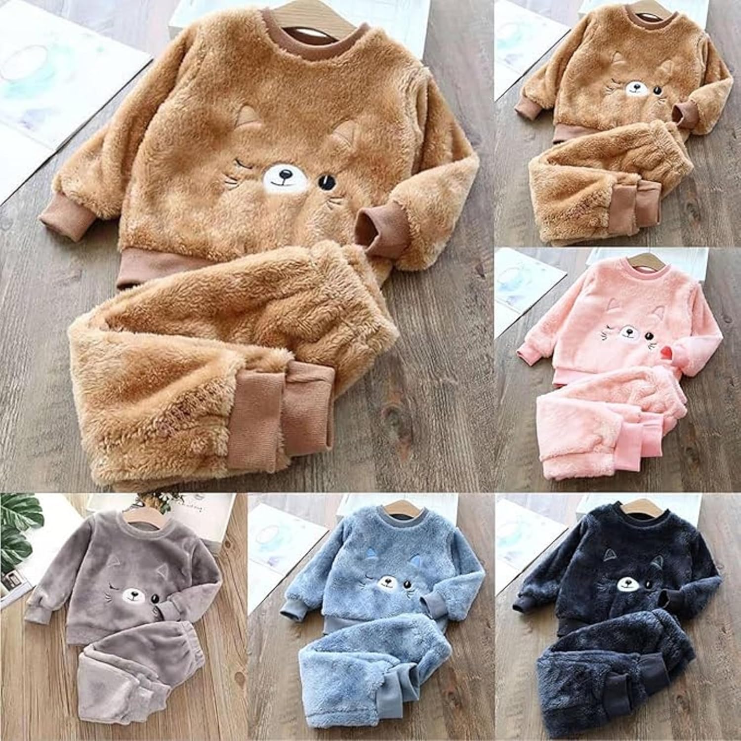 طقم شتوي للأطفال من خامة فرو ناعمة – ملابس شتوية مريحة برسومات كرتونية لطيفة للاطفال من ميزة