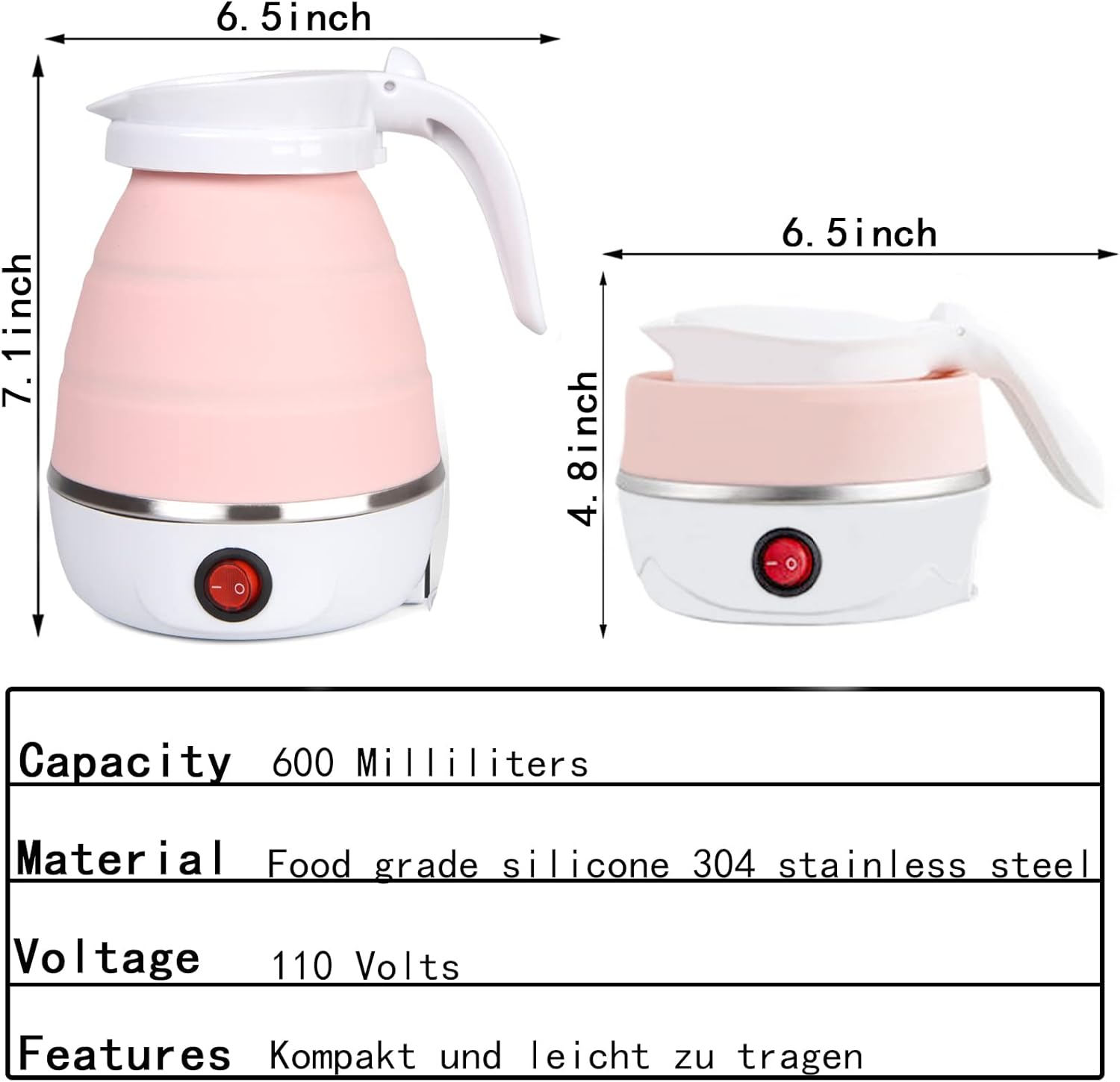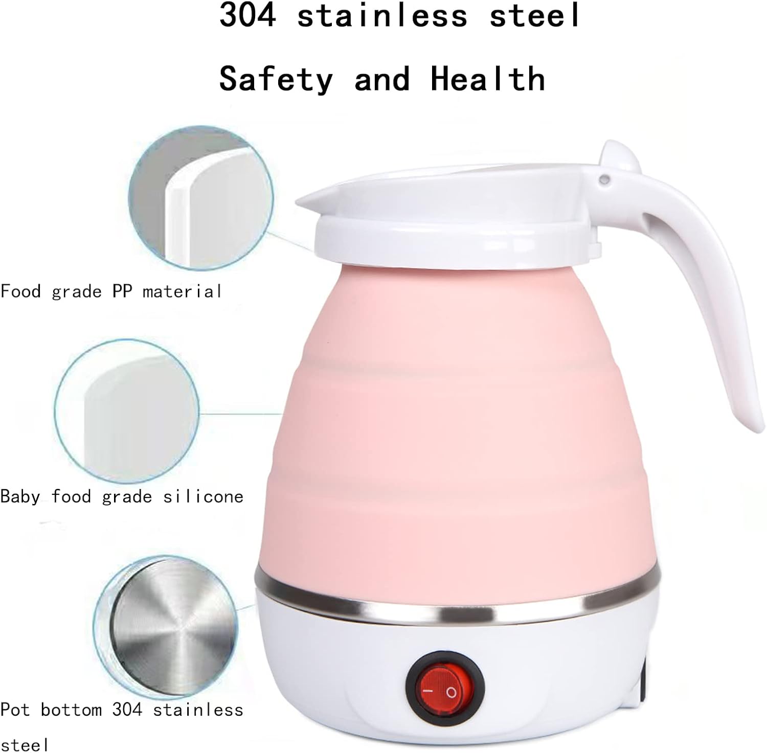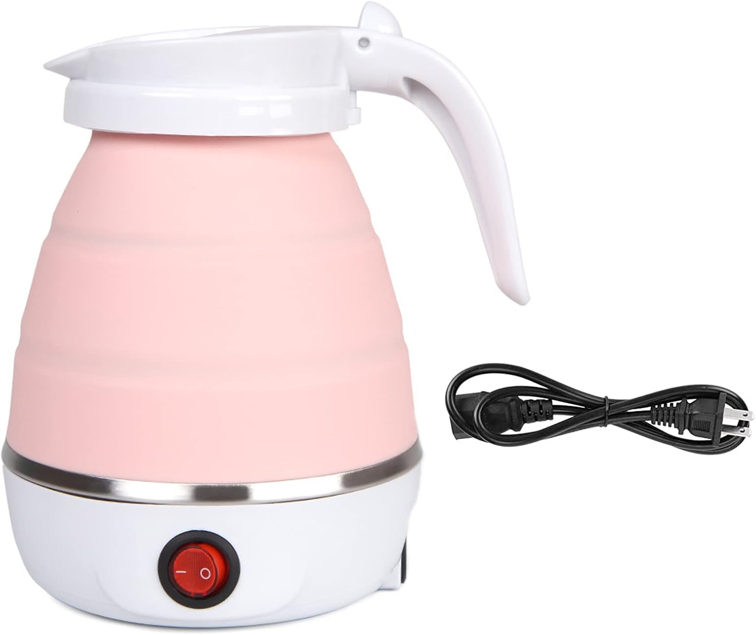 غلاية كهربائية صغيرة محمولة قابلة للطي للسفر، غلاية وسخان ماء من السيليكون للتسخين والتخييم، سهلة التخزين مع سلك طاقة قابل للفصل (بينك)