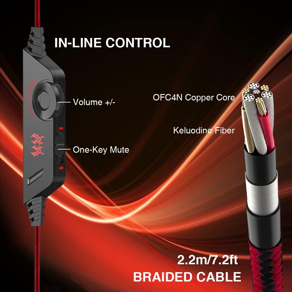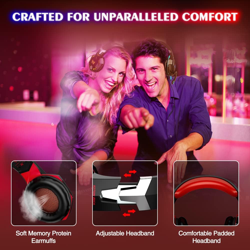 【تجربة لعب غامرة】 مصابيح LED مذهلة مصممة على أغطية الأذن تزيد حماسة أجواء لعبتك بسرعة. يوفر لك مشغل النيوديميوم المغناطيسي عالي الدقة 50 ملم مجال صوت حيوي، وصوت ستيريو عالي الجودة للعب الألعاب.