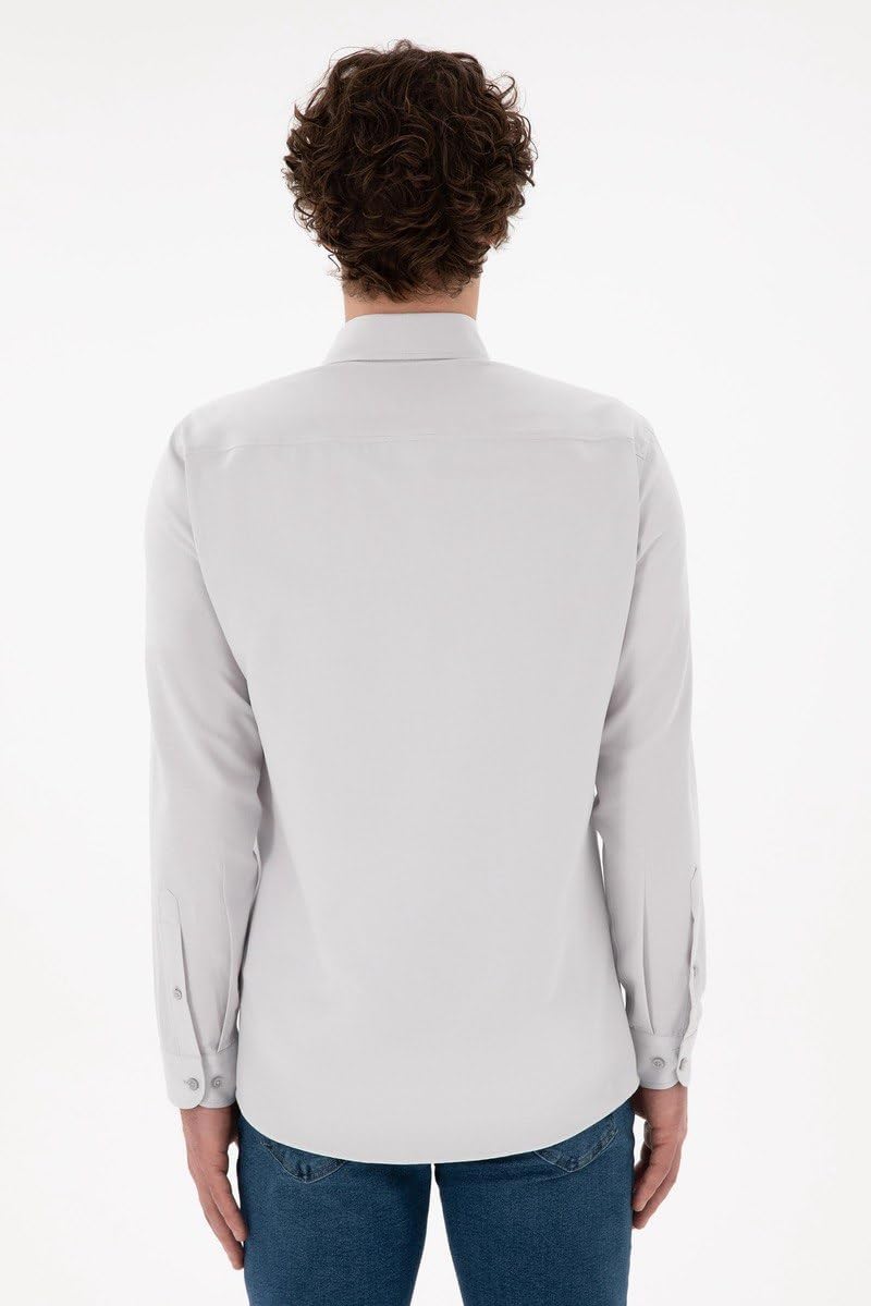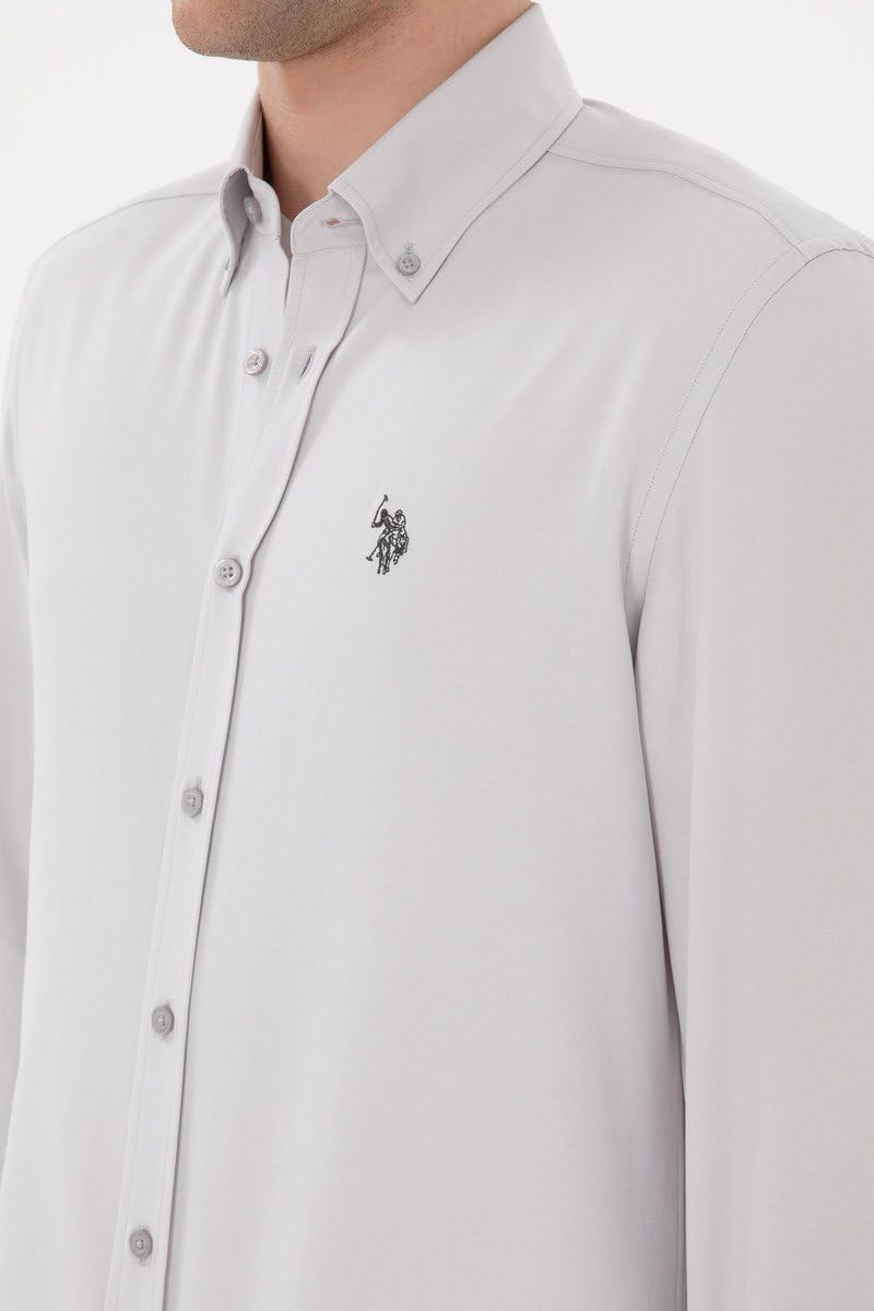 قميص بقصة ضيقة واكمام طويلة ولوجو مطرز وازرار امامية للرجال من يو اس بولو اسن، لون رمادي فاتح، مقاس XL
