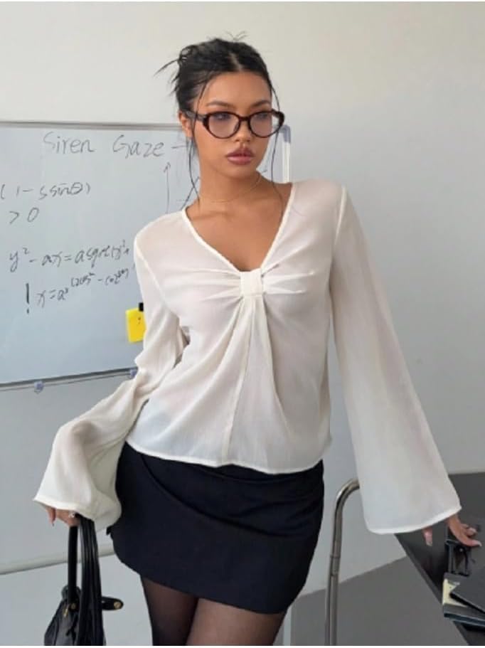 شراء قميص شيفون سادة باكمام طويلة ورقبة شكل V للنساء، تصميم ملتف على الطراز الفرنسي للربيع/الصيف اون لاين من امازون او نون قميص شيفون سادة باكمام طويلة ورقبة شكل V للنساء، تصميم ملتف على الطراز الفرنسي للربيع/الصيف