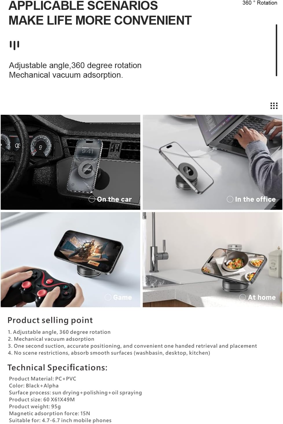 【مثالي لمختلف السيناريوهات】: يعمل على الأسطح الملساء مثل الأبواب الزجاجية وبلاط السيراميك وأسطح الأكريليك والمعدن المصقول والستانلس ستيل والألومنيوم والكروم والجدران المطلية الملساء (خاصة مع اللمسات النهائية اللامعة أو شبه اللامعة). حامل هاتف السيارة هذا مناسب أيضًا للرخام المصقول أو الجرانيت، وعادة ما يوجد في أسطح الطاولات؛ والأسطح الخشبية الملساء أو المصقولة أو المغلقة؛ والأسطح البلاستيكية الناعمة الأخرى.
