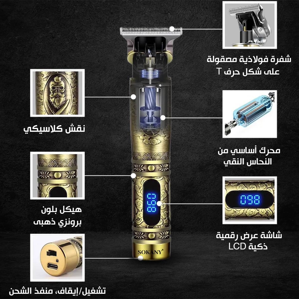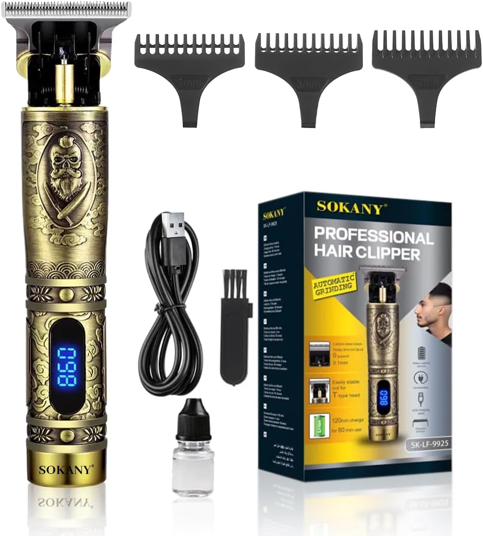 ماكينة حلاقة الشعر الاحترافية من سوكاني شفرات الستيل الكربوني تشغيل سلكي/لاسلكي تشذيب دقيقة تصميم نمط كلاسيكي SK-LF-9925 ذهبي