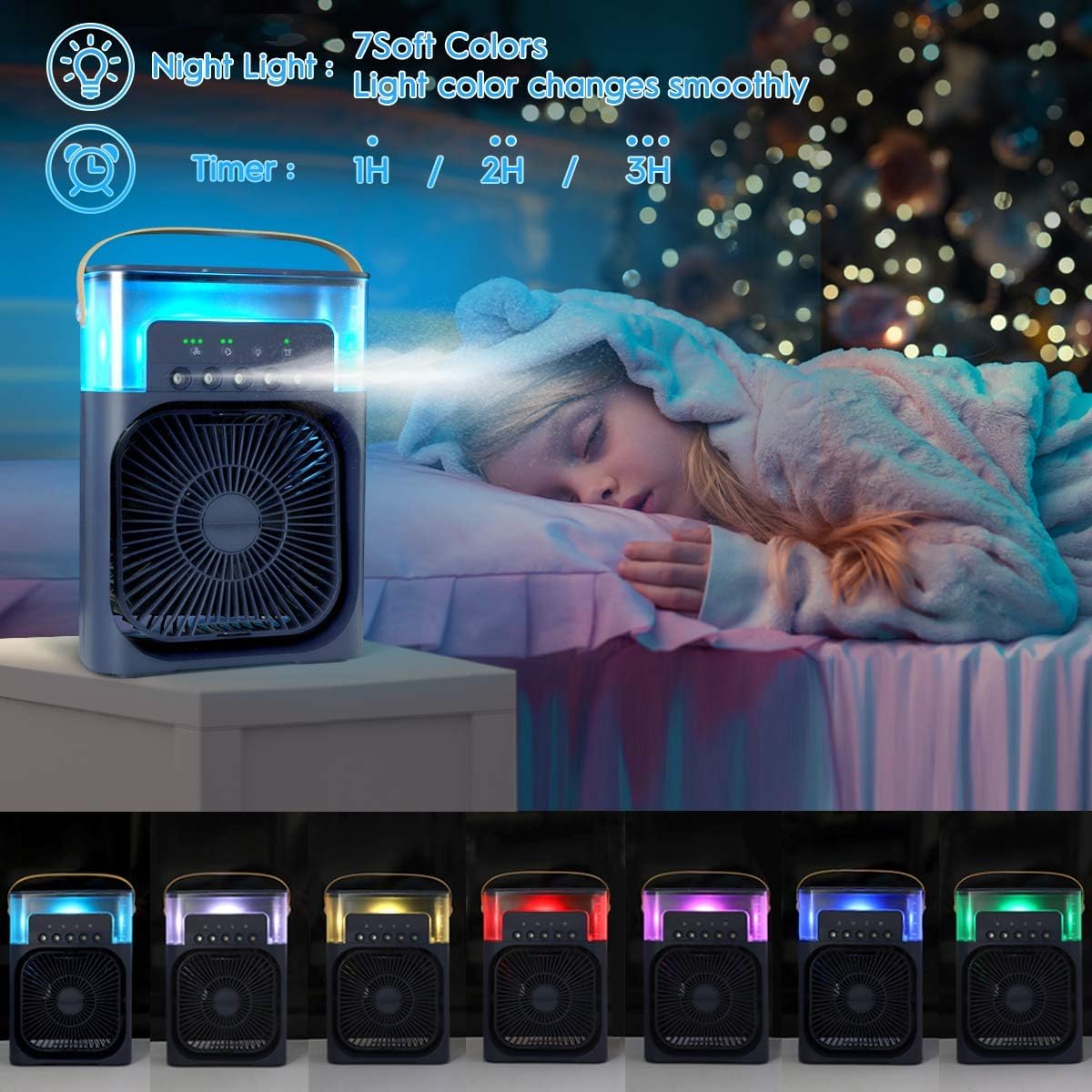 【مؤقت + إضاءة بـ 7 ألوان】ثلاثة توقيت تلقائي (1/2/3 ساعات)، حتى يمكنك اختيار الخيار لأنسب للاستمتاع بوقت فراغك أو النوم أو وقت العمل؛ مروحة مكيف الهواء الصغيرة مدمجة بإضاءة بـ 7 ألوان هادئة. يمكن إيقاف تشغيل الضوء بالكامل أثناء تشغيل المروحة؛ مع 5 بخاخات كبيرة المعيار.