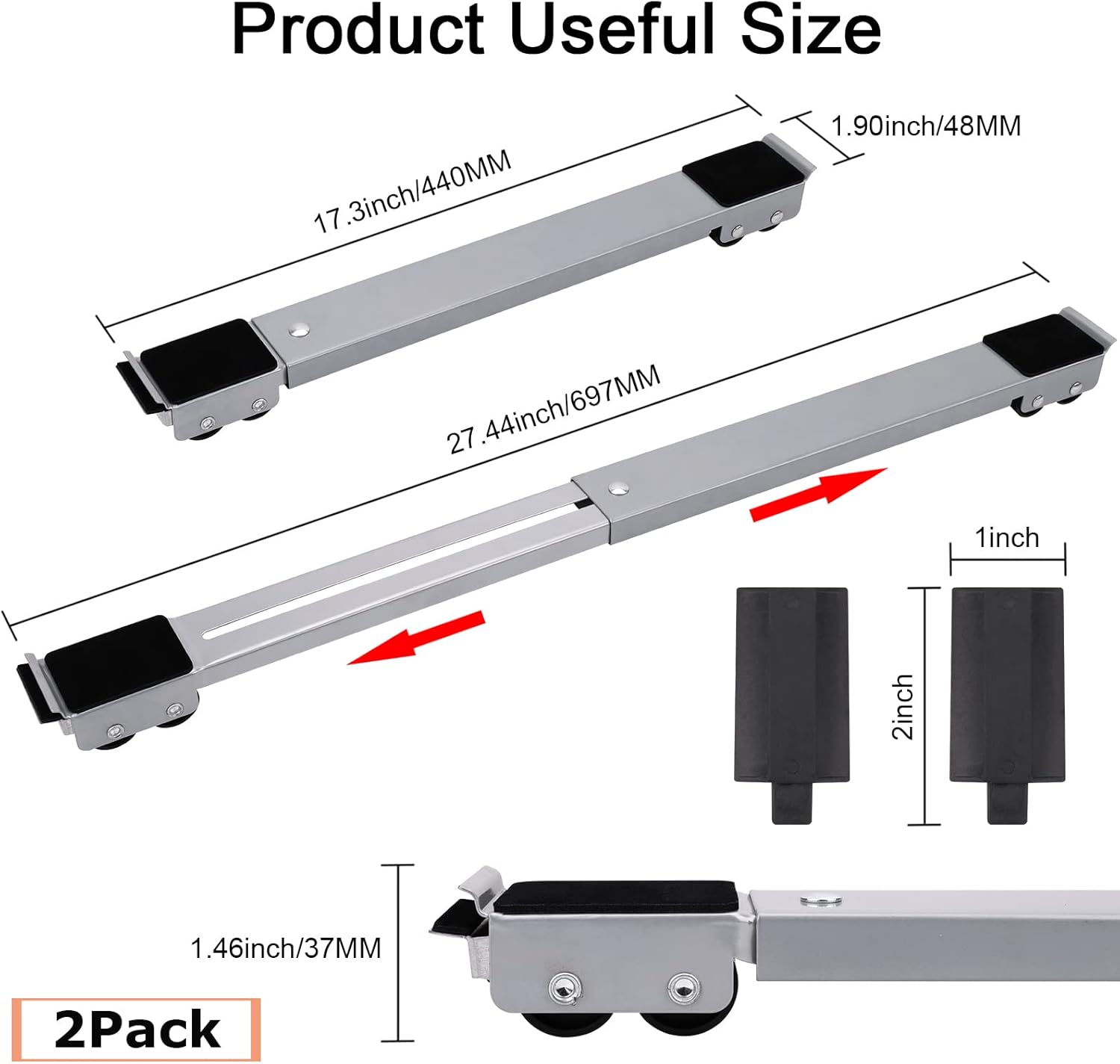【Adjustable Furniture Dolly】 Double-row design, Adjustable base length, The adjustable length of each base is 17.2 Inch to 27.2 Inch and the base height is 1.5 Inch, width is 1.9inch, which can can heavy objects of different sizes, like washing machine, refrigerator, dishwasher, dryer, sofa and other heavy electrical appliances and furniture.