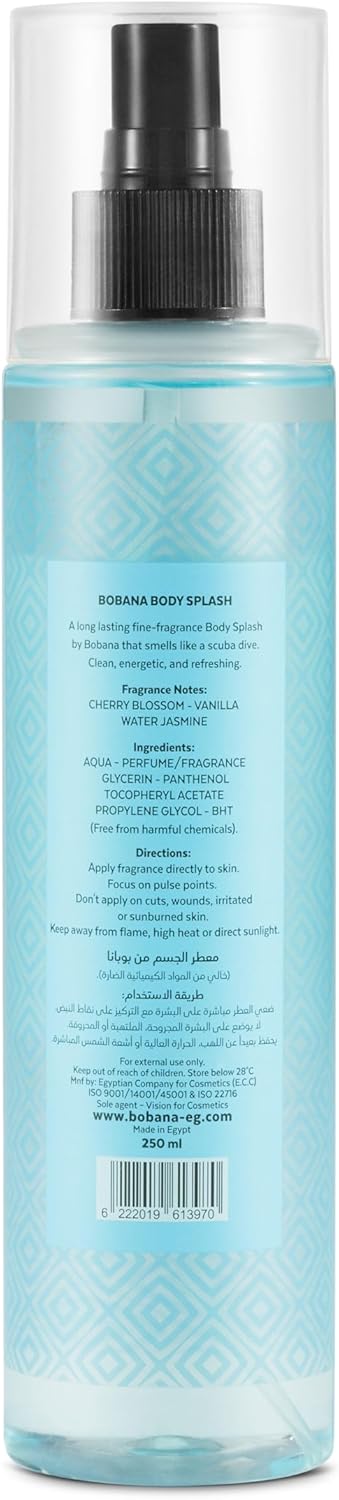 A long lasting fine-fragrance Body Splash by Bobana that smells like a scuba dive. Clean, energetic, and refreshing. Fragrance Notes: CHERRY BLOSSOM – VANILLA – WATER JASMINE Size: 250ml