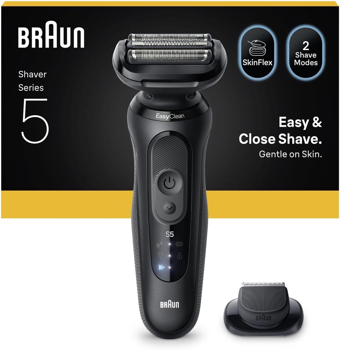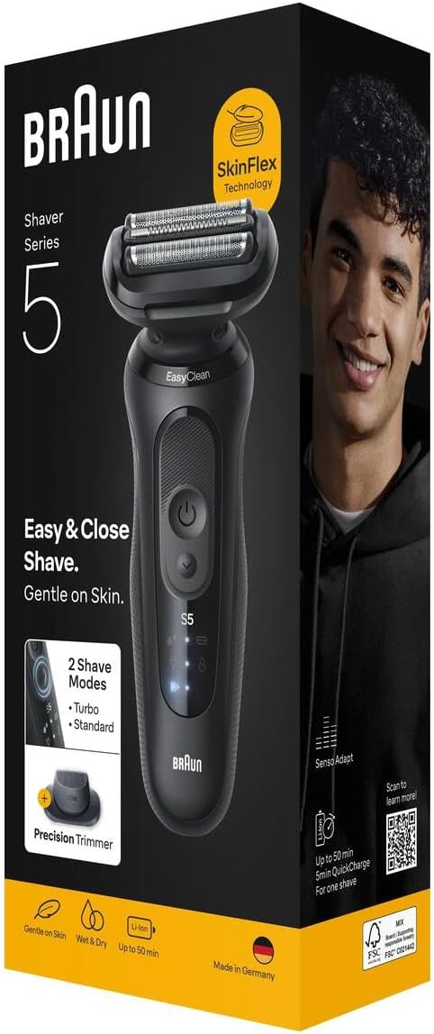 The Braun Series 5 electric shaver offers a simple and quick shave. The 3 flexible blades comfortably adapt to the contours of your face. The 2 shaving modes (Turbo mode and Standard mode) allow you to customize the shave to your needs. The Li-Ion battery provides a wireless runtime of up to 50 minutes and a 5-minute quick charge. The Series 5 electric shaver for men is 100% waterproof. Made in Germany.