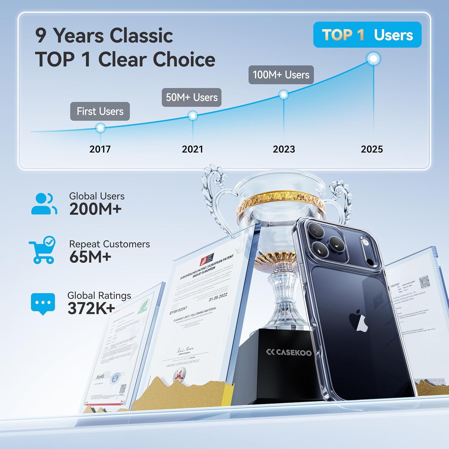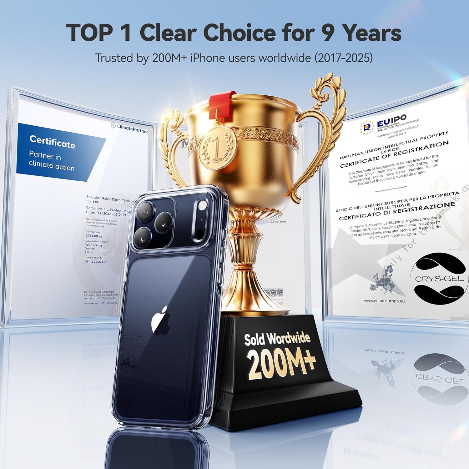[100% Crystal Clear & 3X Anti-Yellow] Crafted with the first batch of premium German Bayer TPU with advanced AR technology for maximum clarity, this case showcases your new iPhone 17 Pro Max’s original color. Enhanced with the latest CRYS-GEL anti-yellowing technology, it resists discoloration and stays crystal clear longer.