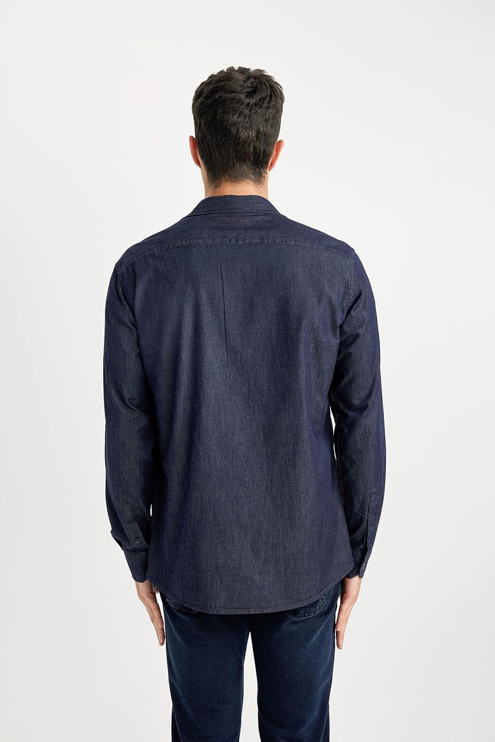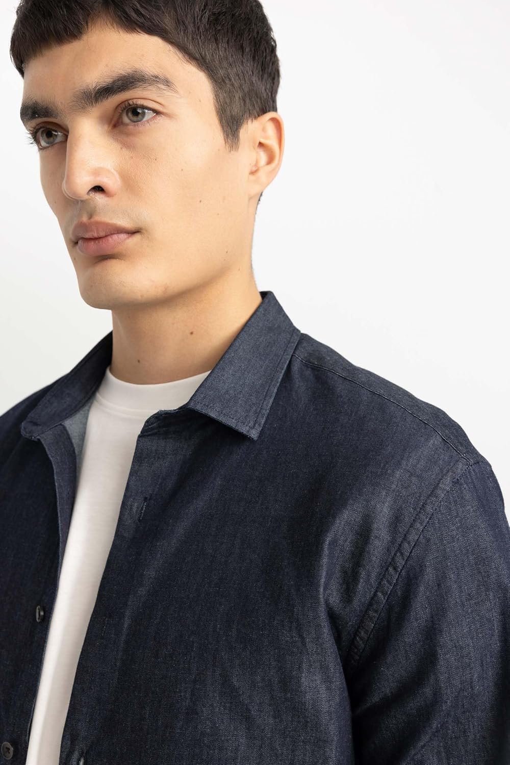 DeFacto Man Slim Fit Polo Neck Long Sleeve Navy Woven Top Long Sleeve Shirt