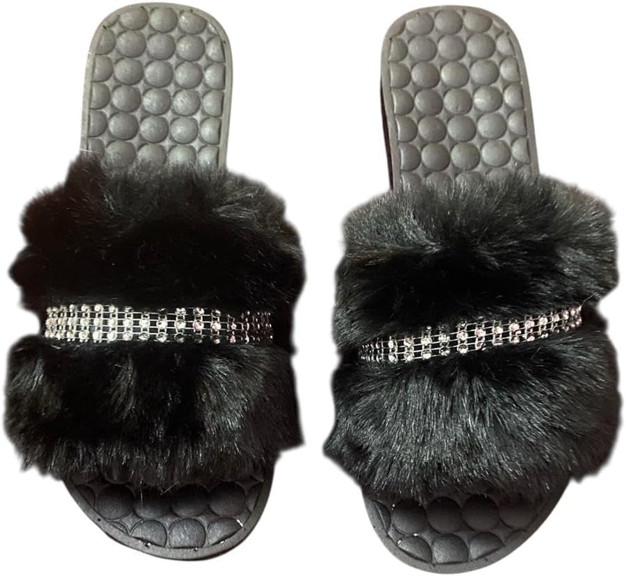 Fur Slippers for Women and Girls – Black Fur Slipper with Comfortable Medical Sole – Anti-Slip Rubber Material – Perfect for Home, Beach and Street – with Shiny Crystal Stripe