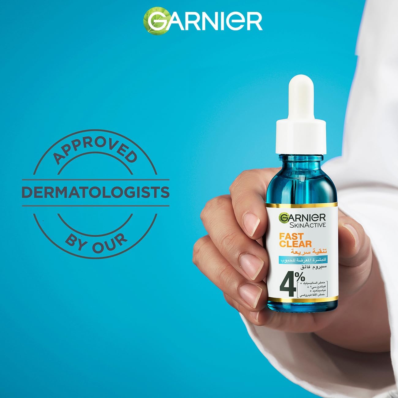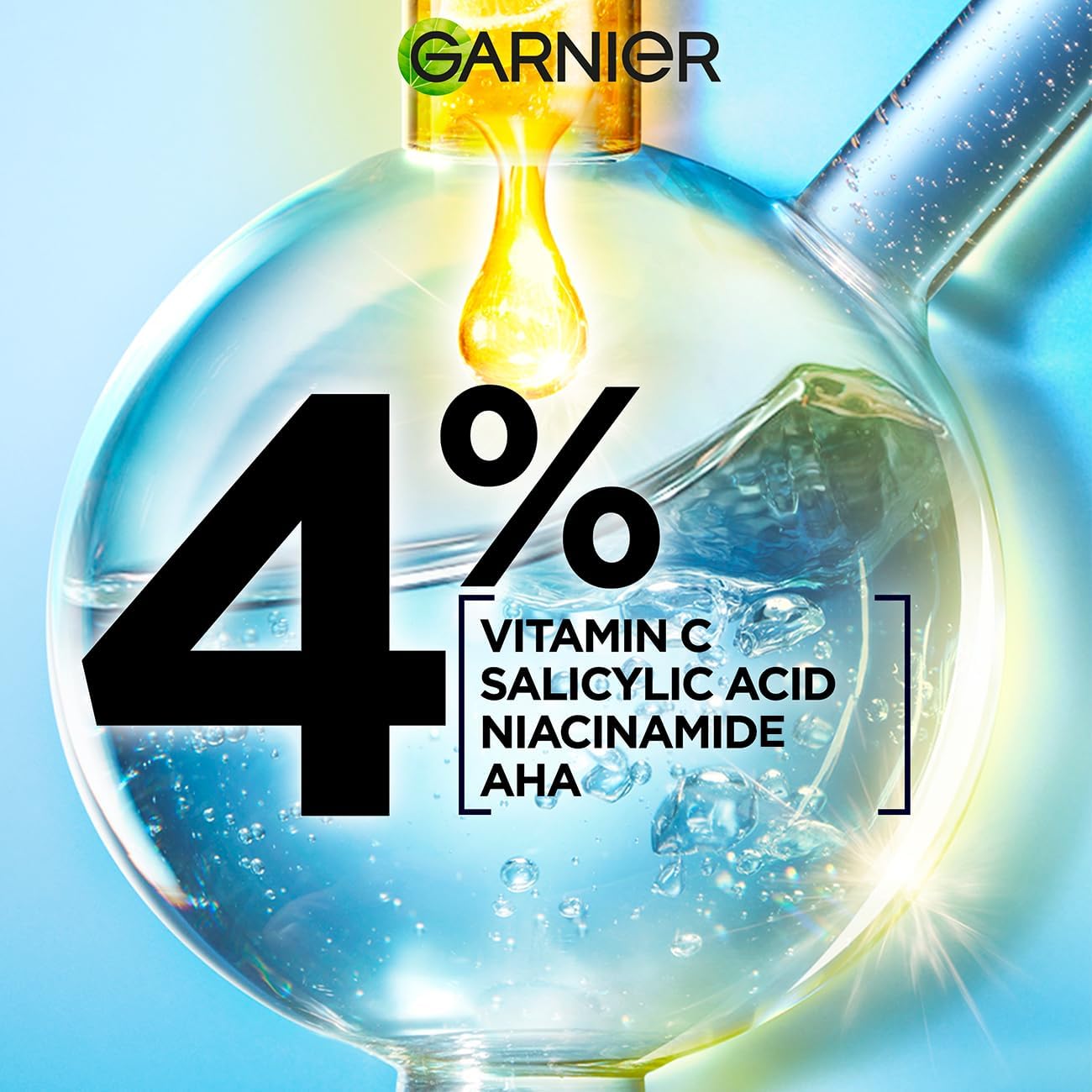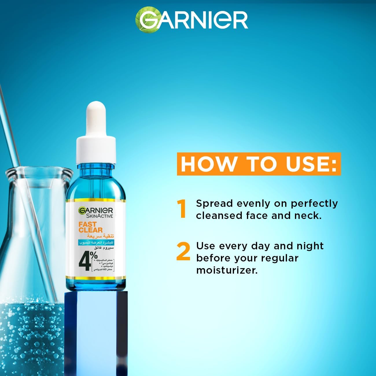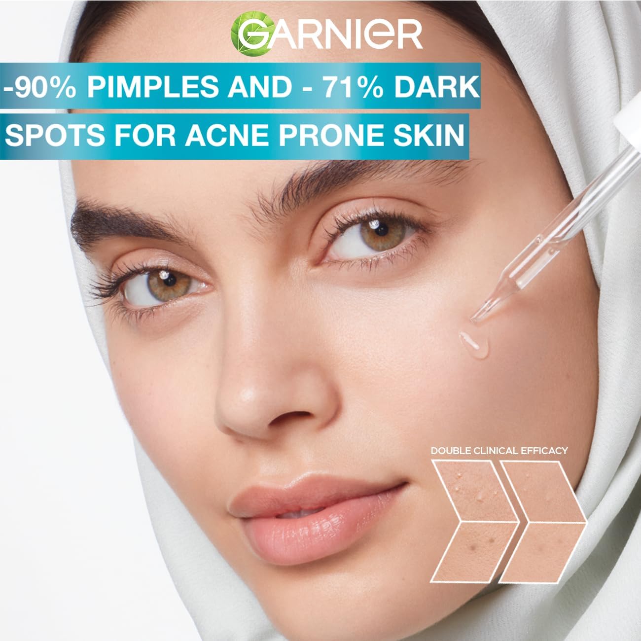 Discover our new Garnier Fast Clear Booster Serum, with our highest ever concentration of 4% (Salicylic Acid Vitamin C^ Niancinamide AHA). After 1st Use you can expect -35% excess oiland 46% radiance. In 28 days you can expect 90% less pimples visibility. During formulation, highest concentration vs Garnier Fast Bright Serum ^Vitamin Cg= Vitamin C derivative. Clinical Test, 37 women. Clinical evaluation, 81 women. Clinical assessment,43 women.