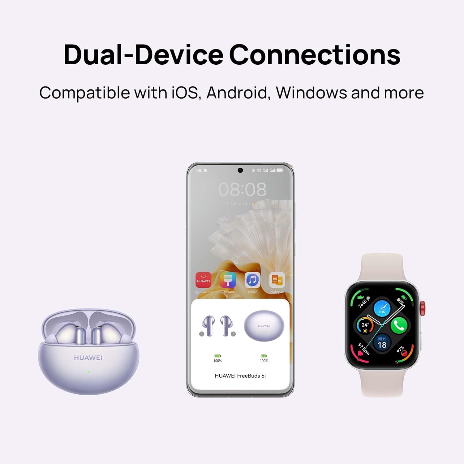 【Intelligent Dynamic ANC 3.0】FreeBuds 6i’s intelligent ANC 3.0 system gets to work cancelling out various kinds of noise, with theability of monitoring environmental noises and adjusting the noise cancellation performance seamlessly. 5 kHz ultra-wide ANC frequency,100% Noise Cancellation Capability Improved