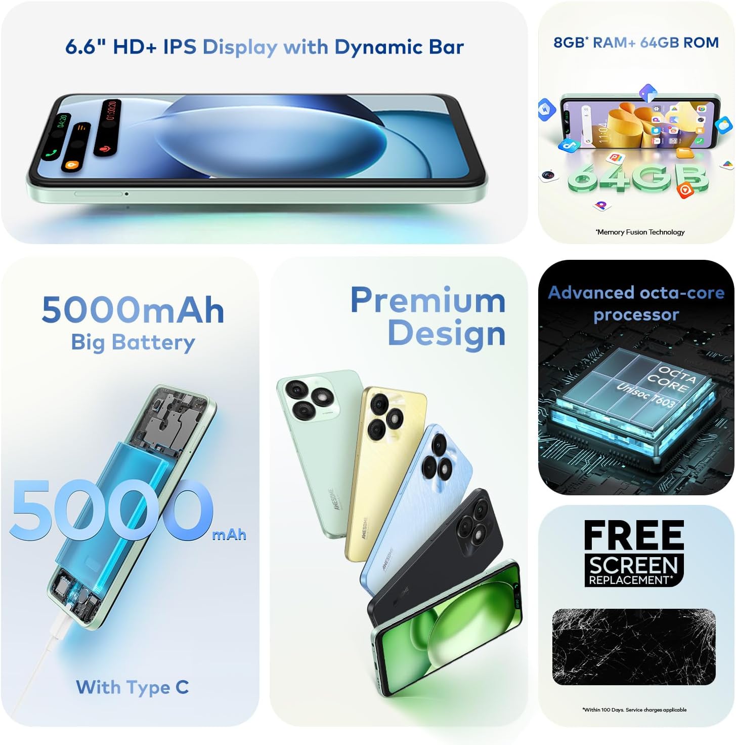 itel A50|6.6″ HD+ Display with Dynamic Bar| 3GB RAM +64GB ROM, Upto 8GB RAM with Memory Fusion|Octacore Processor|8MP AI Dual Rear Cam|5000 mAh Battery | Lime Green