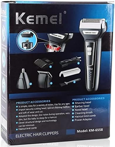 Number of Speed Settings : 1 Brand : Kemei Power Source : Electric & Battery Model Number : KM – 6558 Type : Multi Usage Targeted Group : Men Operating Function : Dry Number of Heads : 3 Are batteries needed to power the product or is this product a battery : 1 Is this a Dangerous Good or a Hazardous Material, Substance or Waste that is regulated for transportation, storage, and/or disposal? : 0 External Product ID Type : Not Available