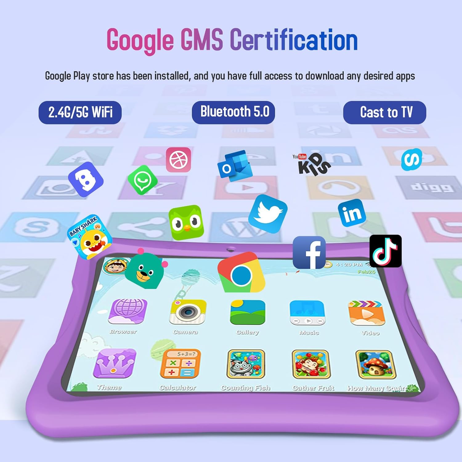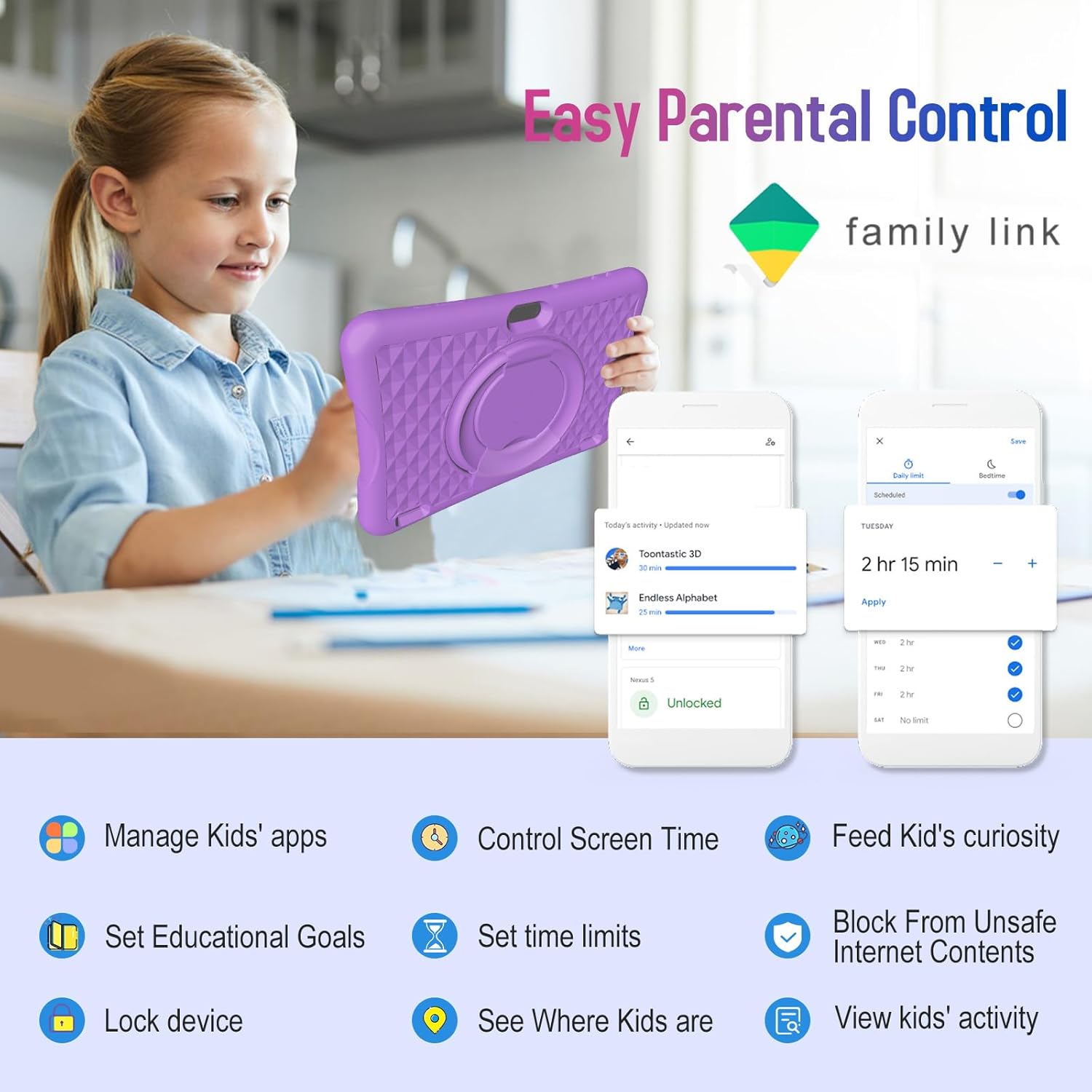 【PARENTAL CONTROL + GOOGLE KIDS SPACE】Ensure a safe online experience with advanced parental controls on this tablet for kids. Easily manage activities, set screen time limits, and filter content using Google Family Link. Preloaded with Google Kids Space, it offers teacher-approved apps for learning and play, making setup simple and secure