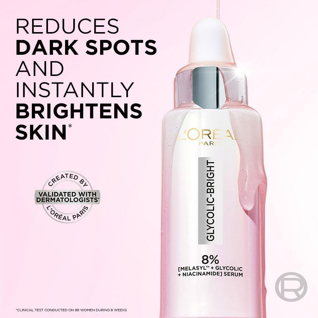 L’Oréal Skincare Laboratories developed INSTANT GLOWING SERUM formulated with 1.0% Glycolic Acid. Clinically proven to brighten skin and visibly reduce dark spots. With the smallest molecular weight amongst all Alpha Hydroxy Acids, it is absorbed deeply to help with skin rejuvenation. (1) Visibly reduces dark spots (2) Evens skin tone (3) Improves radiance VISIBLE RESULTS* Immediately: Skin is smoother and visibly glowing. In 2 weeks: Dark spots are visibly reduced. Skin is more even and looks brighter.