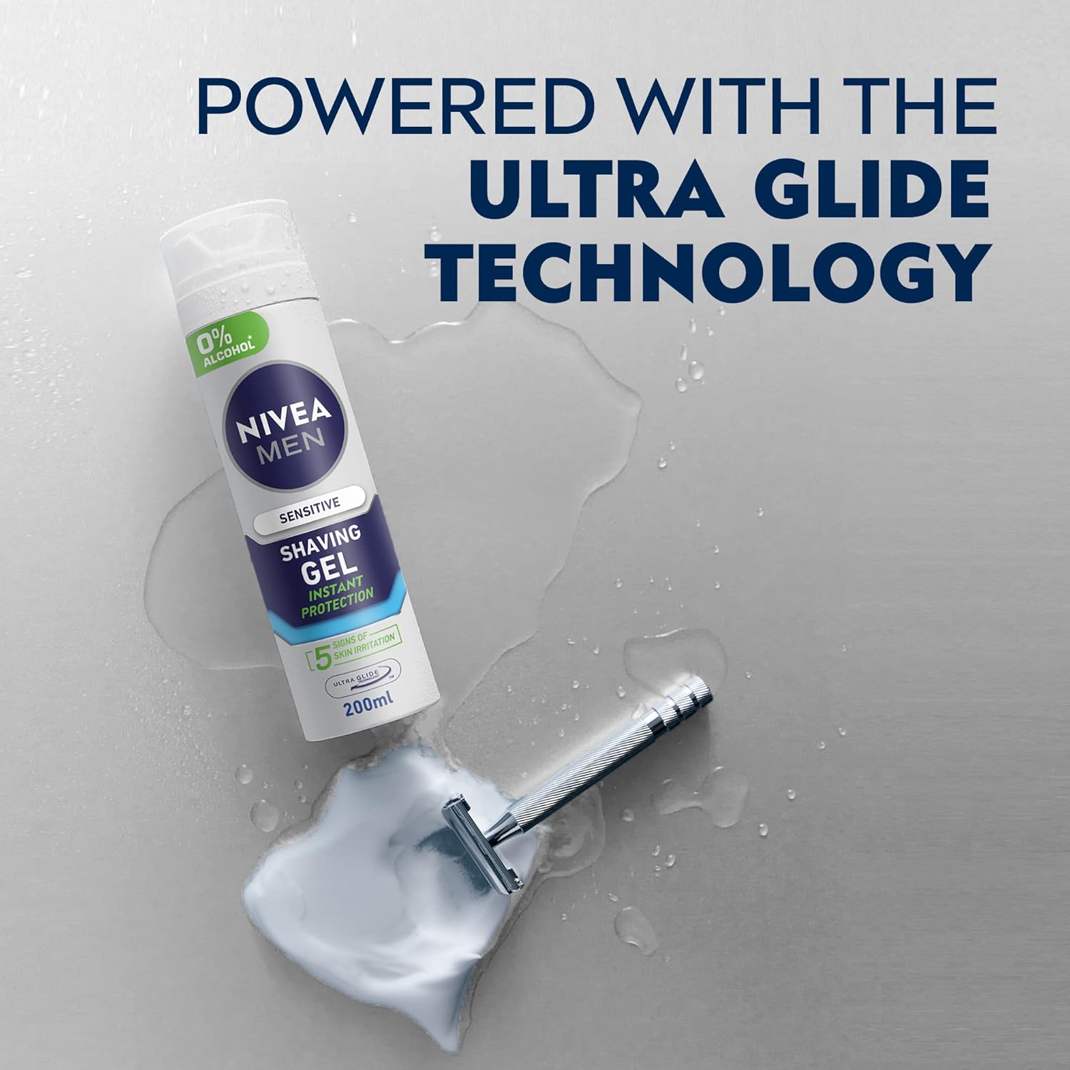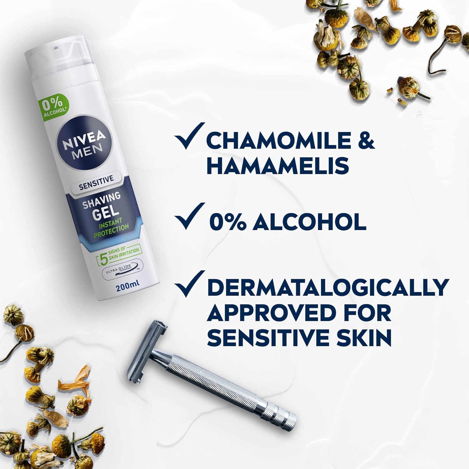 tired of skin irritation while shaving protect your skin with sensitive shaving gel by nivea mennivea men sensitive shaving gel is an extra gentle formula developed to provide a comfortable shave and leave your skin looking healthy and cared forformulated with 0 alcohol nivea men sensitive shaving gel does not burn and is enriched with chamomile and hamamelis extracts to care for your skin before you shave this fragranceneutral foam is powered with the ultra glide technology to ensure a close clean and comfortable shave while protecting your skin from micro cuts and irritationsnivea men it starts with youfeaturesenriched with chamomile and hamamelis extracts provides a close and comfortable shave protection against micro cuts and irritations effective razor glide with ultra glide technology skin compatibility dermatologically approved by men with sensitive skin