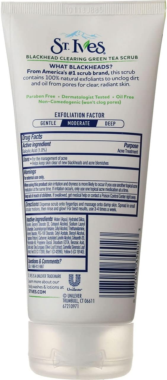 #FeedYourSkin! St. Ives Blackhead Clearing Green Tea Face Scrub helps unclog pores and clears blackheads. From America’s No. 1 scrub brand*, duh. The St. Ives facial scrub is a derma‐tested, blackhead‐tackling scrub made with salicylic acid. It moderately exfoliates, helping to clear blackheads and unclog pores, for a more even skin tone. It’s also infused with olive leaf extract which the Egyptians saw as a symbol of heavenly power. And who’d argue with that? Our green tea leaves come from China and are processed in the traditional Chinese way. This involves heating them to stop oxidation so they stay that lovely vibrant green color. The goodness is then extracted very gently by soaking them. It takes a little longer but we think it’s worth it. Natural Ingredients: Green Tea Extract Olive Leaf Extract Hydrated Silica Tell me more! This refreshing scrub is oil free, paraben free, dermatologist tested, and non-comedogenic (meaning won’t clog pores), and has a moderate exfoliation level. It also contains 1% salicylic acid acne medication.
