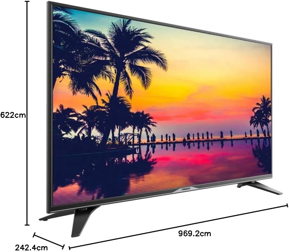 TORNADO LED TV Screen Size : 43 Inch Resolution : 1920 x 1080 ( Full HD ) Aspect Ratio : 16:09 Contrast Ratio : 1:1200 Viewing Angle : 178° USB : Video – Photo – Music Broadcasting Type : Digital ( DVB-T/C/T2/S/S2 ) LED Features :- With Built-In Receiver PVR ( USB Record ) USB Cloning Hotel Mode Child Lock Standby : <0.5 Watt Energy Efficiency Class : ( B ) Inputs and Outputs :- Rf In : 1 ( Digital ) Video In : 1 HDMI : 2 USB : 2 Audio Output Power : 8 Watt x 2 Dimensions ( Width x Height x Depth ) mm :- Without Stand : 969.2 x 566 x 77.3 With Stand : 969.2 x 622 x 242.4 Weight :- Net Weight : 7.3 Kg Gross Weight : 9.8 Kg Country Of Origin : Egypt Warranty : 3 Years Full Free Warranty