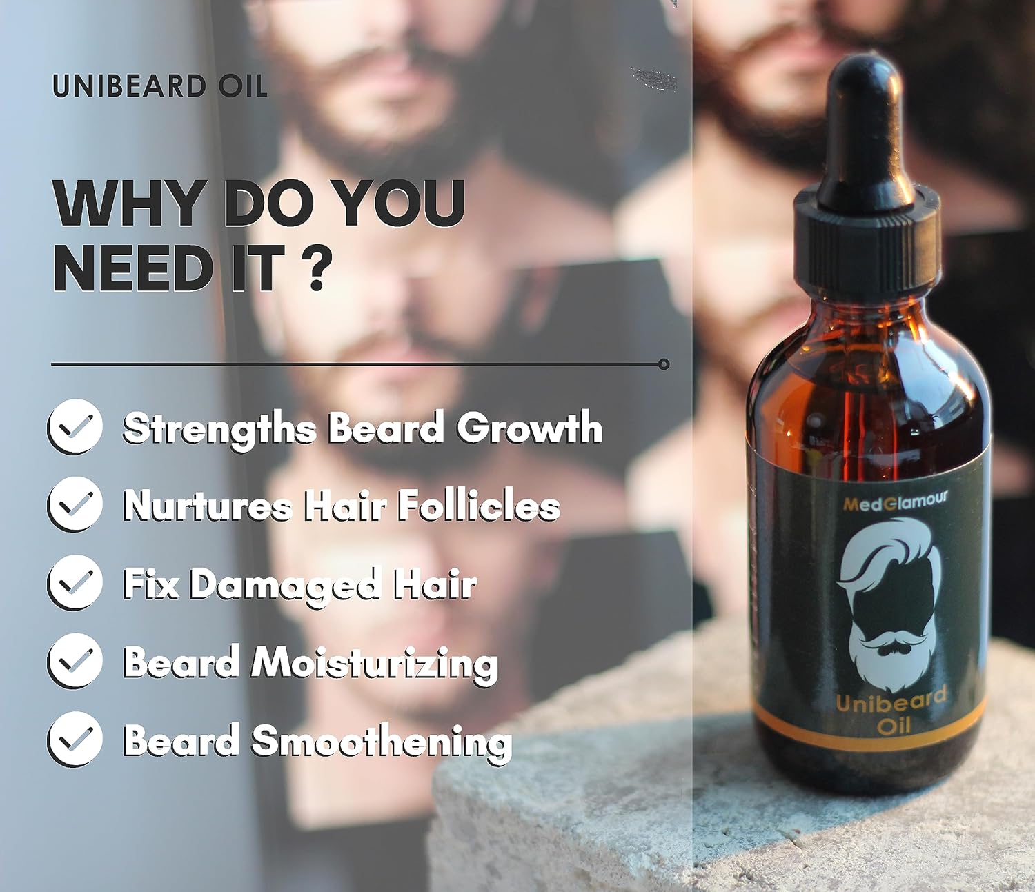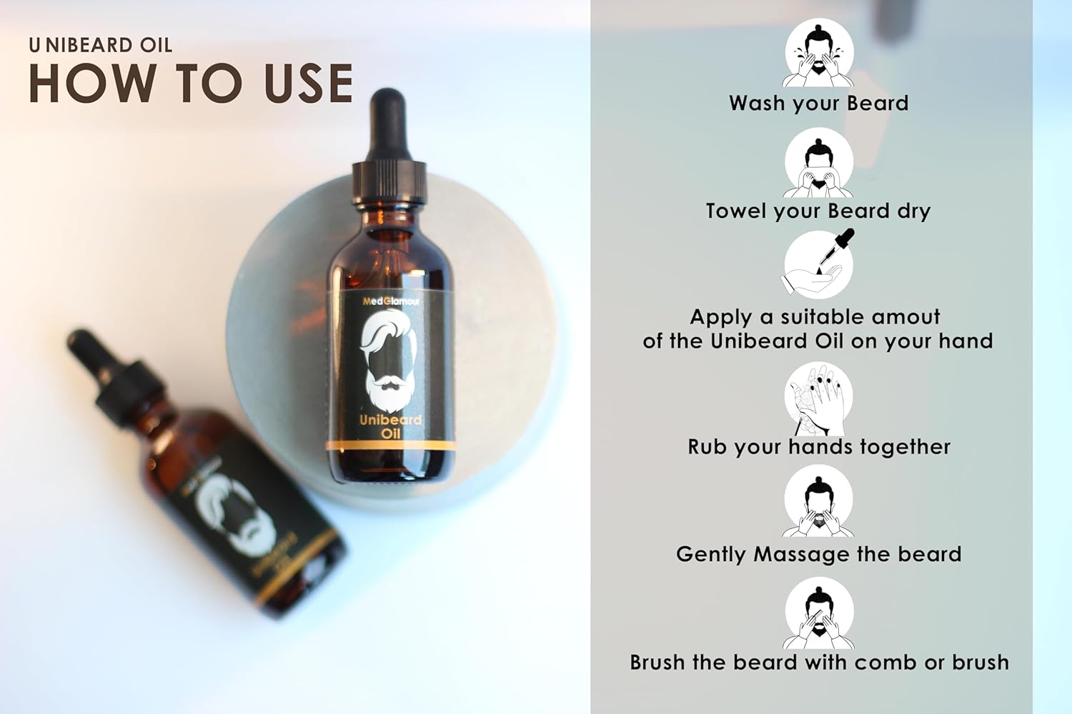 If you are looking to cultivate a striking and healthy beard, look no further than Unibeard Oil. The ingredients in Unibeard oil are Argan, Jojoba, Avocado, Sweet Almond, Grapefruit, Macademia and Vitamin E. The ingredients strengths your beard, nurtures your beard follicles, fix damaged hair, smoothen and moisture your beard. Unibeard oil will also soften your facial hair and reduce itching. Our premium beard oil is expertly formulated with high-quality ingredients to nourish and condition your facial hair, promoting growth and leaving your beard looking and feeling its best. All the ingredients are natural oils without any addition of chemicals or silicone. The lightweight and non-greasy formula is easily absorbed into your skin, leaving you with a smooth and soft beard. Unibeard oil is a daily moisturizer and leave-in conditioner Unibeard oil has an addict-able coconut Scent which will leave you smelling amazing all day long. How to use: Apply daily a suitable amount of oil on the beard. After washing your beard, towel dry. Dispense few drops using the dropper into your hand. Rub hands together and gently message the beard, then use a damped brush or comb to style as desired. Use daily on your beard. Size : 30 ml Brand : Unibeard – MedGlamour.