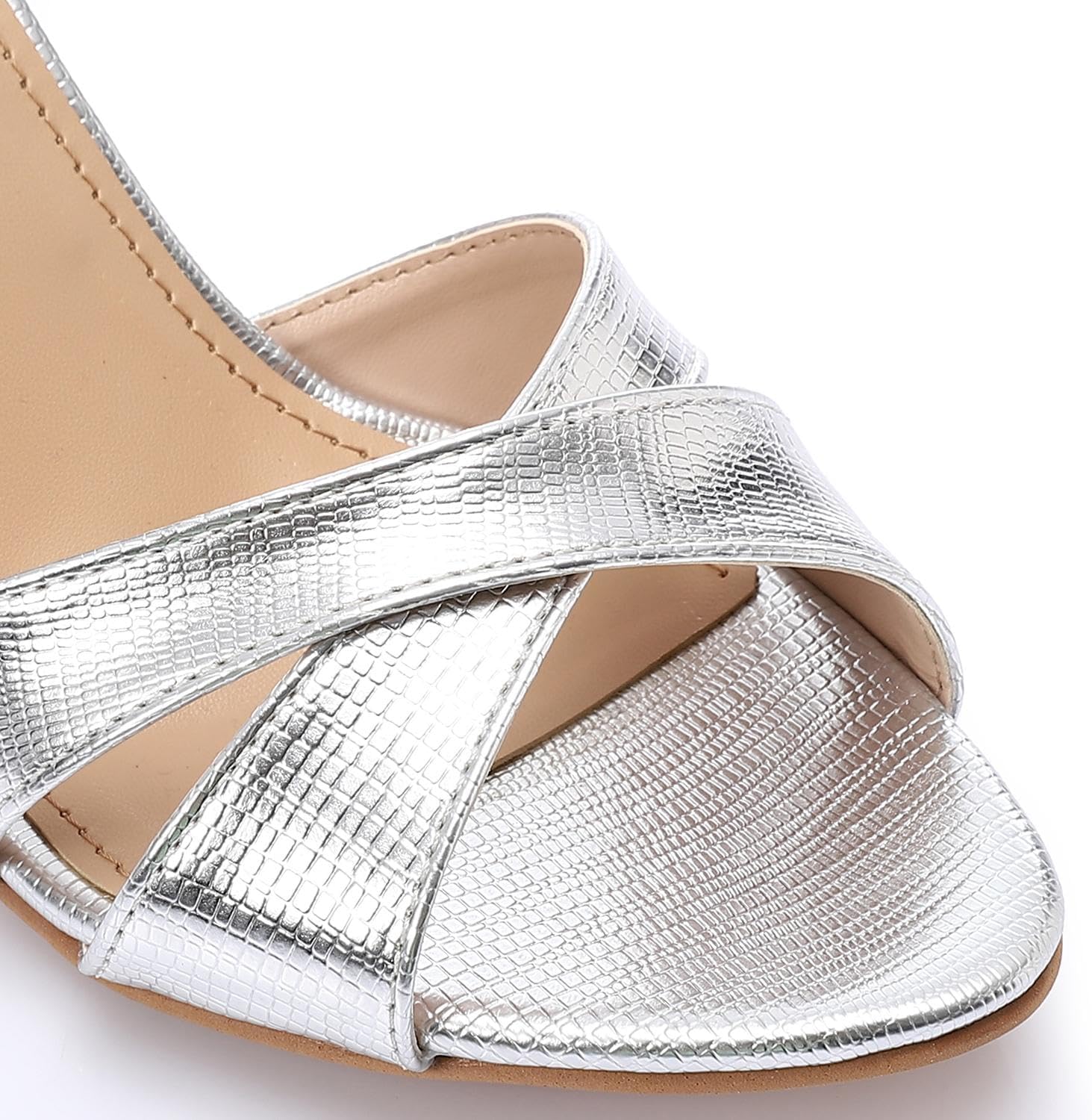 Elegant black women’s sandals made from high-quality materials, featuring a modern and comfortable design. They feature a mid-heel for a sophisticated feminine look, with crisscrossing straps at the front for an elegant touch. They feature an adjustable ankle strap for optimal stability and comfort. Ideal for both everyday and evening wear, they combine elegance and comfort.